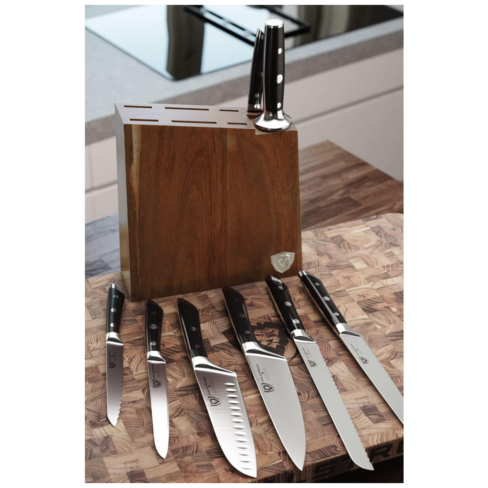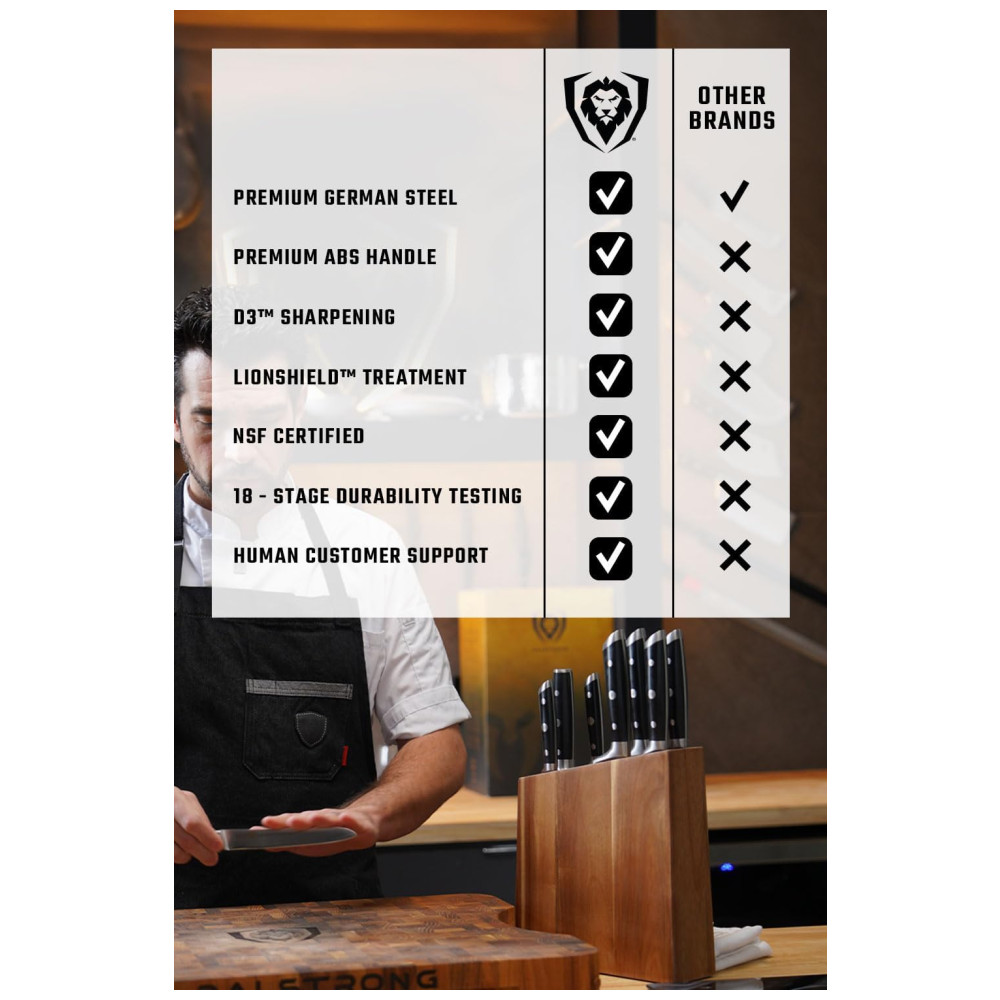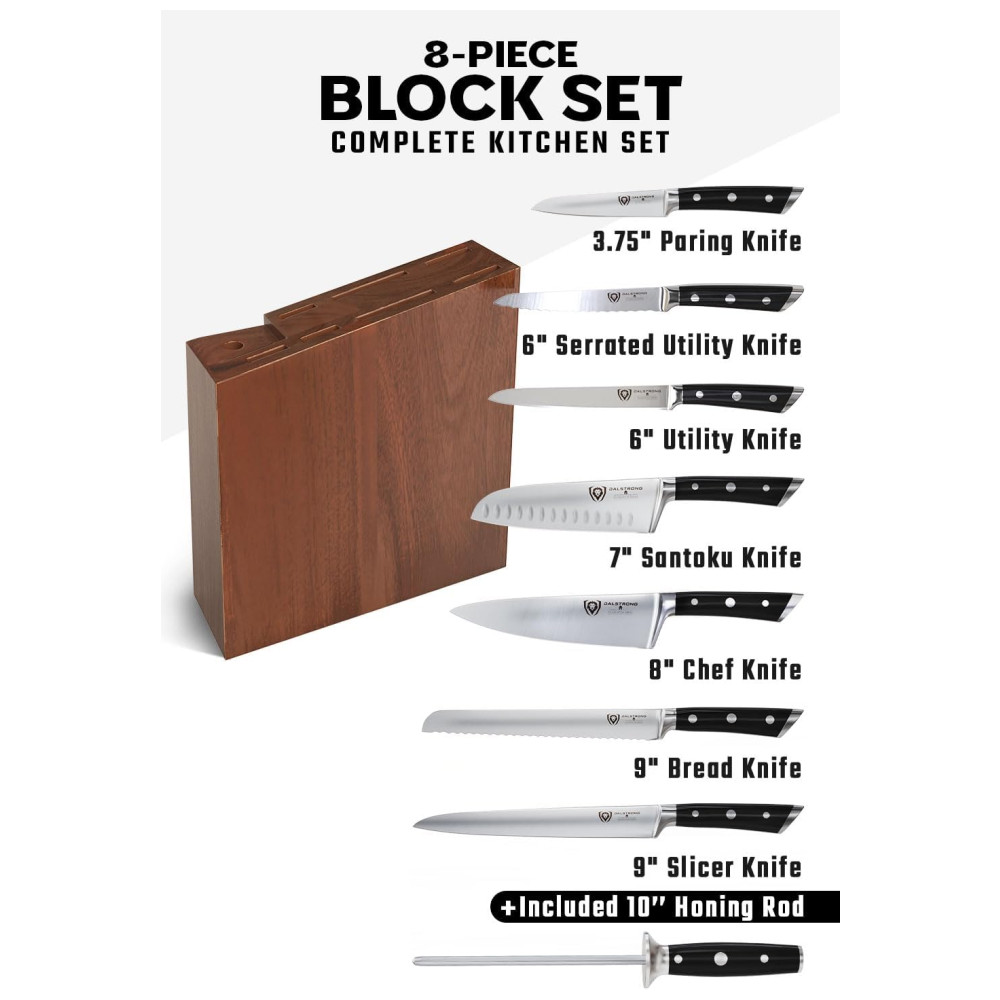 Excelente artesanato, tecnologia de ponta, elementos de design impressionantes e materiais premium. O desempenho máximo nunca foi tão bom a esse preço. Aço alemão de alto carbono importado, incrivelmente nítido e com nitidez nítida, com uma borda polida à mão de 14 a 16 graus por lado. Temperado com precisão e resistente a manchas. Este conjunto durará uma vida. Design premiado, com peso satisfatório, materiais premium e sensação de qualidade. As alças pretas de luxo importadas da pakkawood têm rebites triplos com uma alça que garante conforto e manobrabilidade. Laminado e polido para uma construção sanitária, perfeito para cozinhas movimentadas Projetado com perfeição na dureza 56 Rockwell e polido à mão para um acabamento acetinado. Cuidadosamente afunilado para maior dureza, flexibilidade e resistência mínima ao corte. Todas as facas essenciais para qualquer chef, completas em um impressionante bloco de madeira de acácia feito à mão. Inclui faca do chef, santoku, talha , fatia, pão, utilidade, utilidade serrilhada, facas de paring e vareta de afiar. Veja por que dezenas de milhares de chefs profissionais e cozinheiros domésticos amam e confiam na DIFERENÇA DALSTRONG