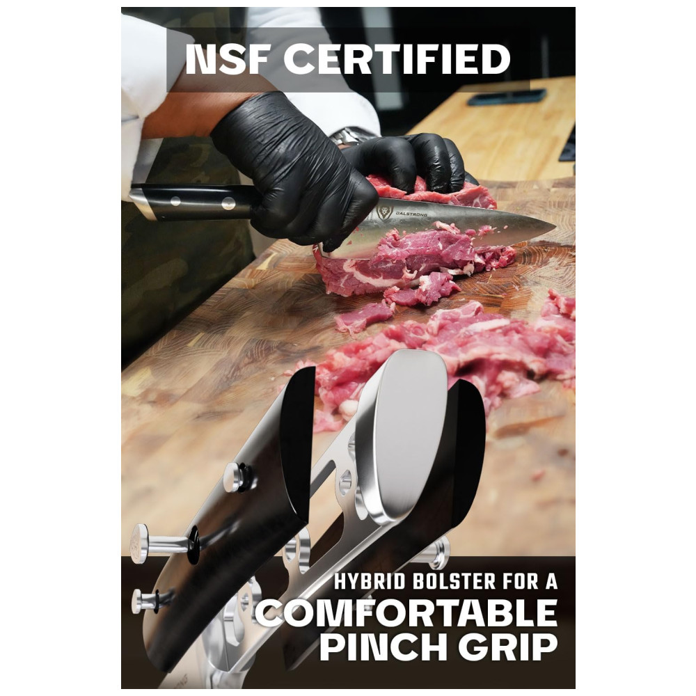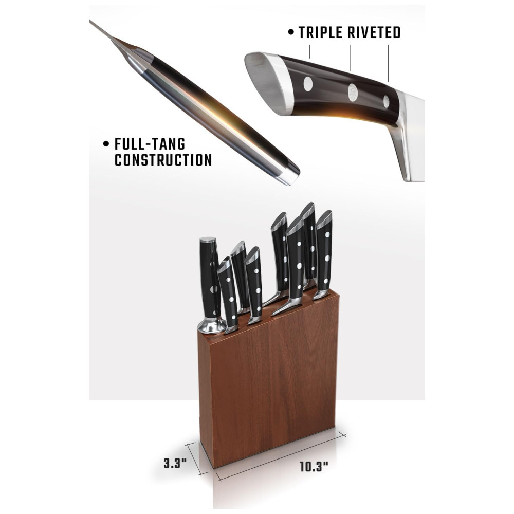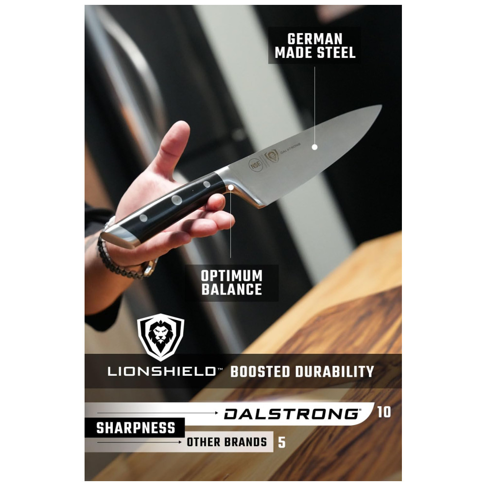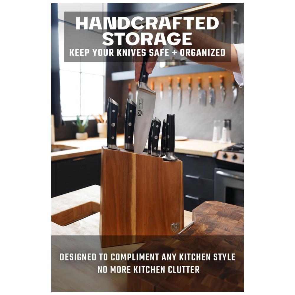 Excelente artesanato, tecnologia de ponta, elementos de design impressionantes e materiais premium. O desempenho máximo nunca foi tão bom a esse preço. Aço alemão de alto carbono importado, incrivelmente nítido e com nitidez nítida, com uma borda polida à mão de 14 a 16 graus por lado. Temperado com precisão e resistente a manchas. Este conjunto durará uma vida. Design premiado, com peso satisfatório, materiais premium e sensação de qualidade. As alças pretas de luxo importadas da pakkawood têm rebites triplos com uma alça que garante conforto e manobrabilidade. Laminado e polido para uma construção sanitária, perfeito para cozinhas movimentadas Projetado com perfeição na dureza 56 Rockwell e polido à mão para um acabamento acetinado. Cuidadosamente afunilado para maior dureza, flexibilidade e resistência mínima ao corte. Todas as facas essenciais para qualquer chef, completas em um impressionante bloco de madeira de acácia feito à mão. Inclui faca do chef, santoku, talha , fatia, pão, utilidade, utilidade serrilhada, facas de paring e vareta de afiar. Veja por que dezenas de milhares de chefs profissionais e cozinheiros domésticos amam e confiam na DIFERENÇA DALSTRONG