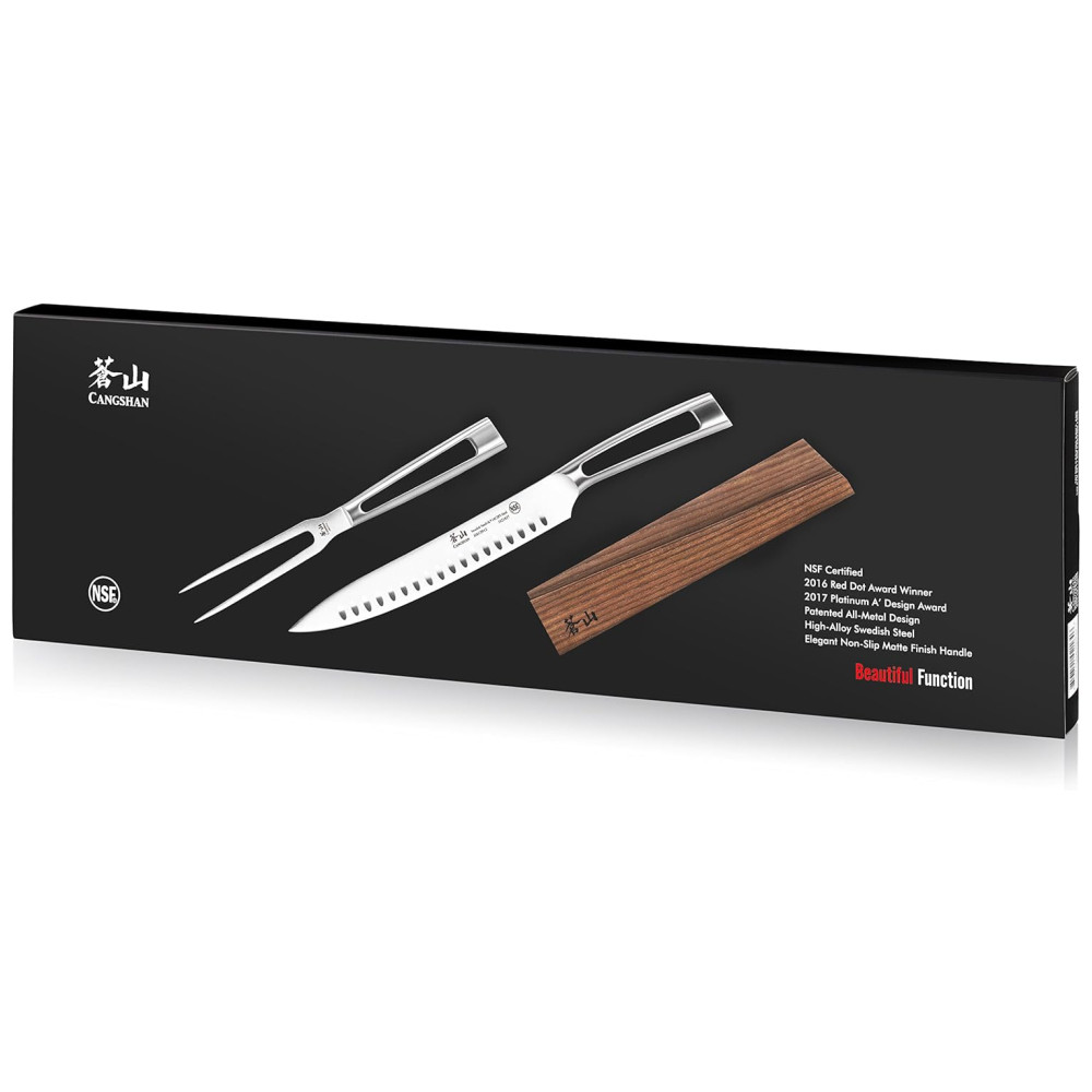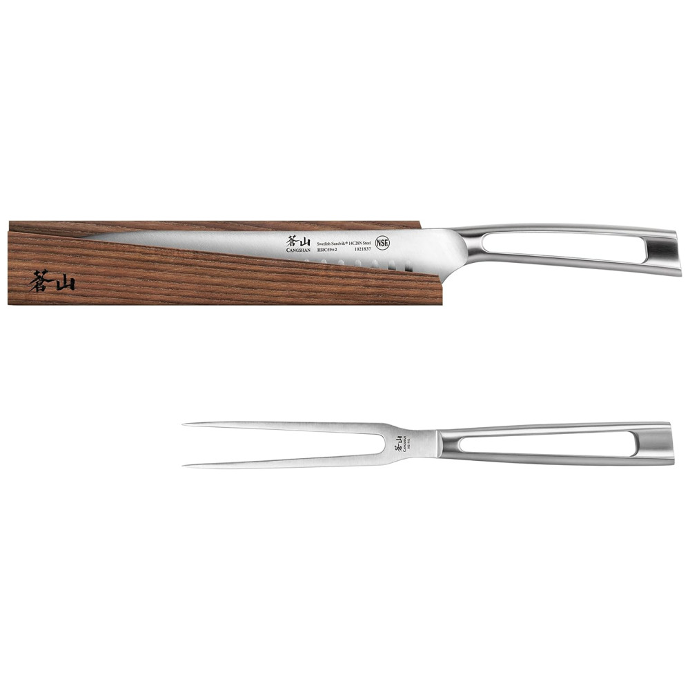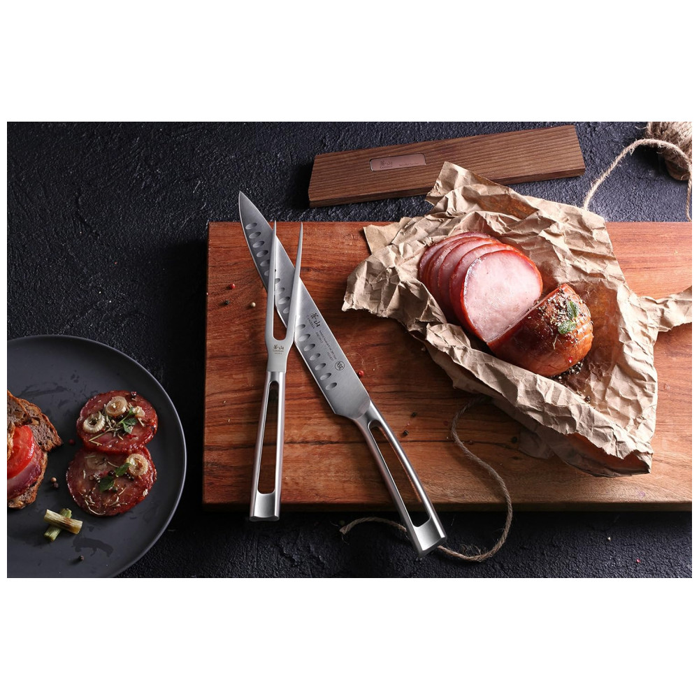 Forjadas completas em aço sueco Sandvik 14C28N de alta liga com nitidez excepcional, retêm uma borda até 5 vezes mais que o aço alemão X50Cr15MoV RedDot 2016 Award patenteado com foco no design exclusivo da estrutura metálica e cabo de acabamento mate ergonômico o conjunto de facas de 2 peças inclui faca de corte lâmina de 9 polegadas, cabo de 5,5 polegadas e garfo de corte total de 11 polegadas Cada faca é fornecida com a bainha magnética semi aberta Ashwood sólida carbonizada.