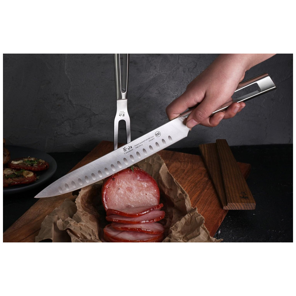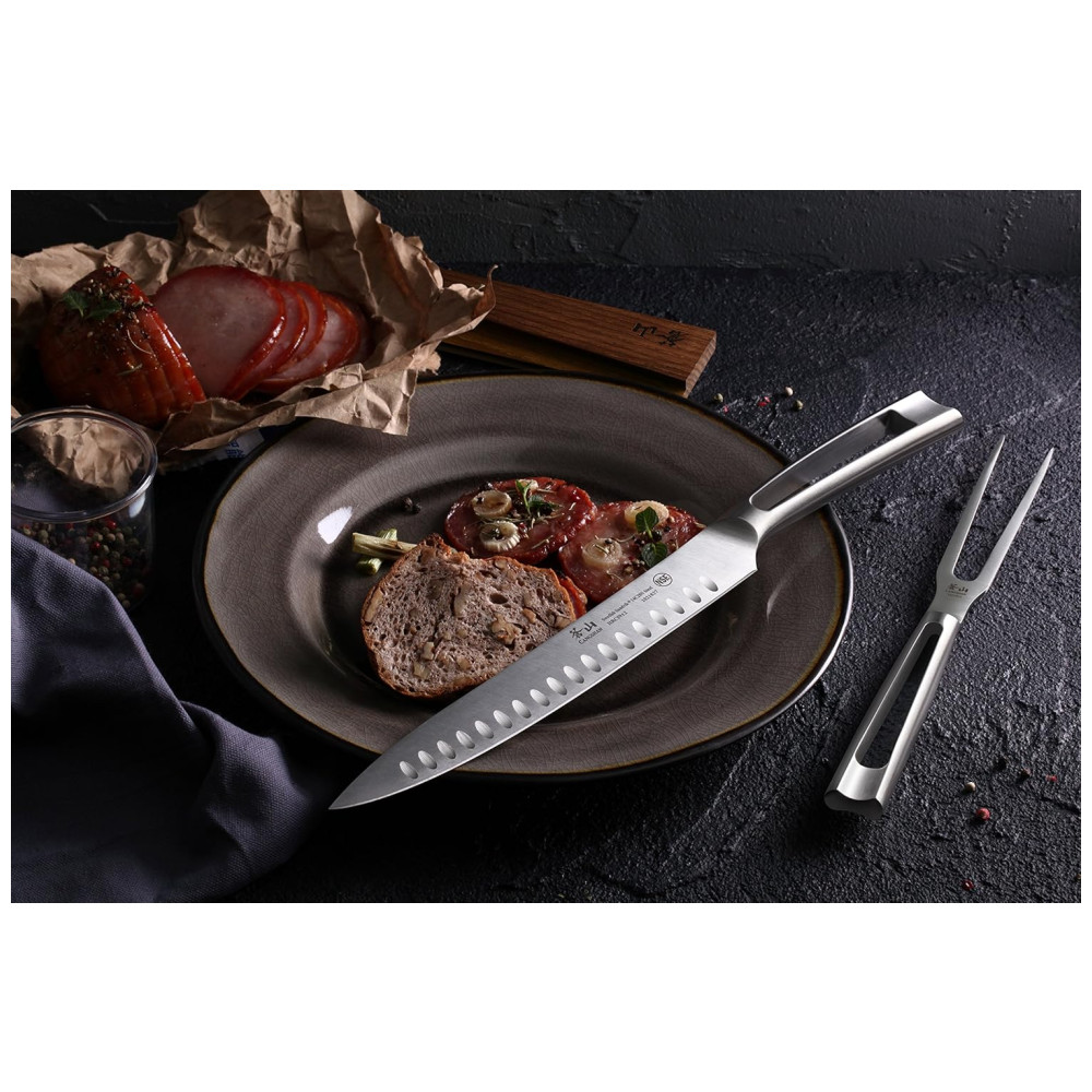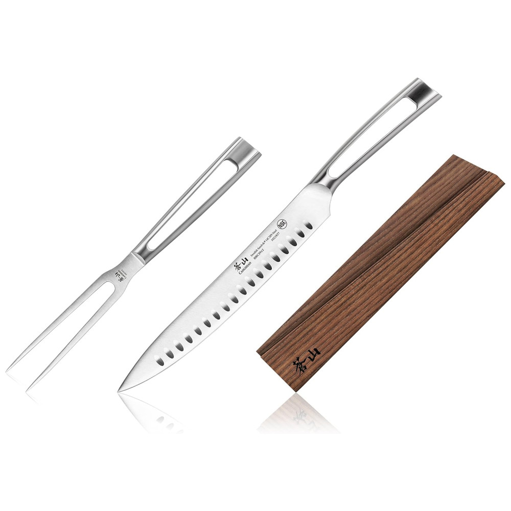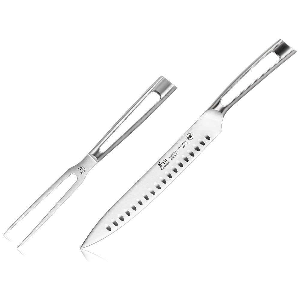 Forjadas completas em aço sueco Sandvik 14C28N de alta liga com nitidez excepcional, retêm uma borda até 5 vezes mais que o aço alemão X50Cr15MoV RedDot 2016 Award patenteado com foco no design exclusivo da estrutura metálica e cabo de acabamento mate ergonômico o conjunto de facas de 2 peças inclui faca de corte lâmina de 9 polegadas, cabo de 5,5 polegadas e garfo de corte total de 11 polegadas Cada faca é fornecida com a bainha magnética semi aberta Ashwood sólida carbonizada.