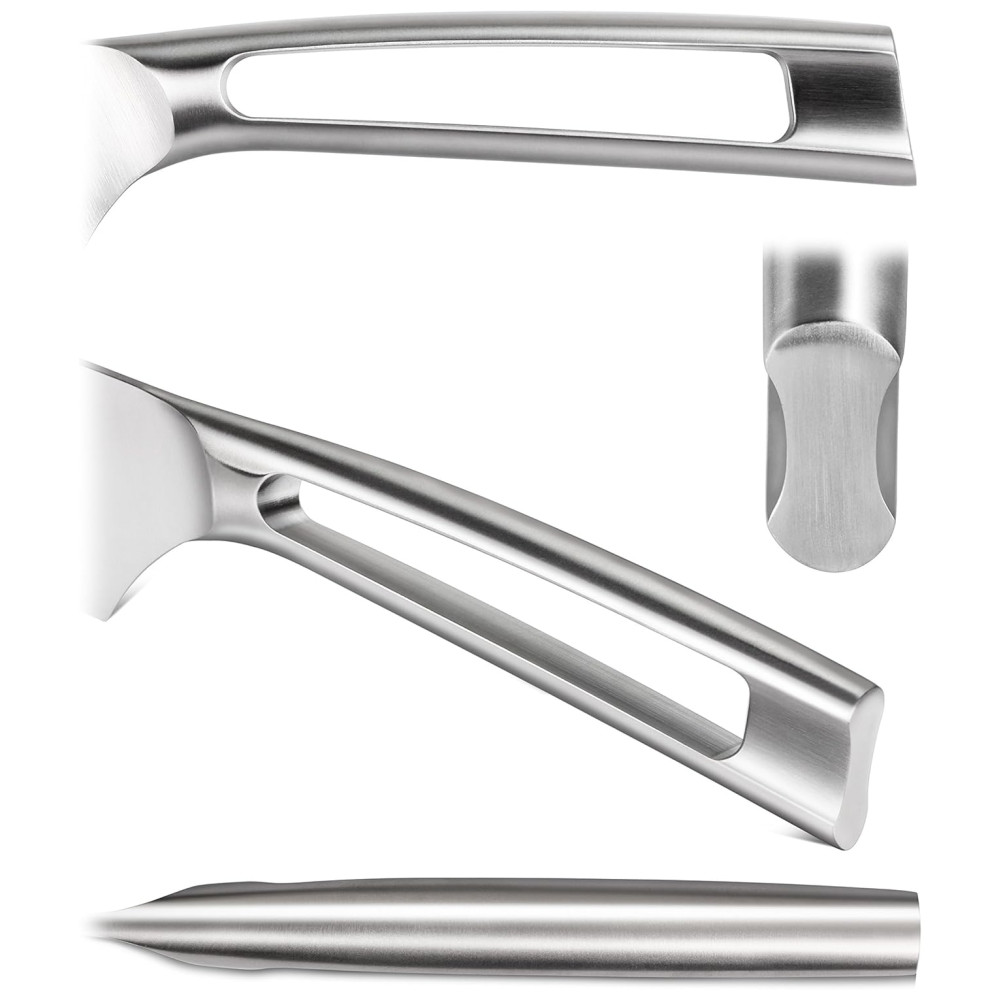 Série TN1 A Série TN1 contrasta sua beleza sutil com uma lâmina afiada de ponta reta. A faca toda forjada em metal tem um acabamento fosco que fornece resistência superior para durabilidade excepcional. Um design minimalista e elegante com alça oca garante que essas facas sejam confortáveis e esteticamente agradáveis. Cada faca é bem equilibrada e perfeitamente trabalhada, permitindo o uso pesado da cozinha e a limpeza fácil. Materiais de primeira qualidade. Esta faca apresenta o aço Sandvik 14C28N sueco para um produto duradouro e duradouro. O Swedish Steel oferece uma mistura de incrível dureza e durabilidade, com a capacidade de atingir uma classificação de dureza de 59 , 2 na escala de classificação de dureza Rockwell. Esses aços mantêm sua aresta afiada até 5 vezes mais que a German Steel. Isso significa uma faca que fica mais afiada e mais longa