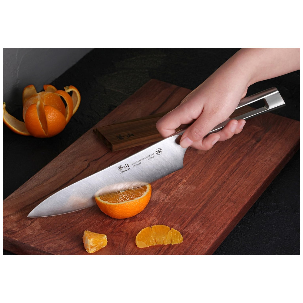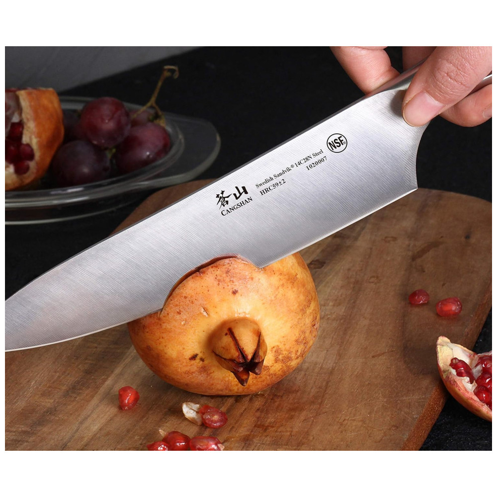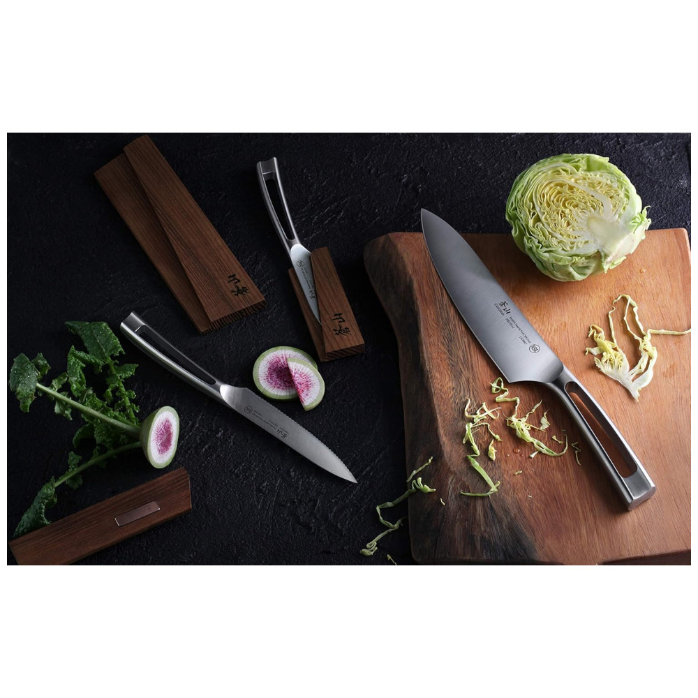 Forjados completos a partir de aço sueco Sandvik 14C28N de alta liga com nitidez excepcional, retêm uma borda até 5 vezes mais do que o aço alemão X50Cr15MoV RedDot 2016 Award patenteado com foco no design da estrutura metálica exclusiva e alça de acabamento fosco ergonômica o conjunto de facas inclui 8 polegadas utilitário serrilhado de 5 polegadas do chef, aparamento de 3,5 polegadas.