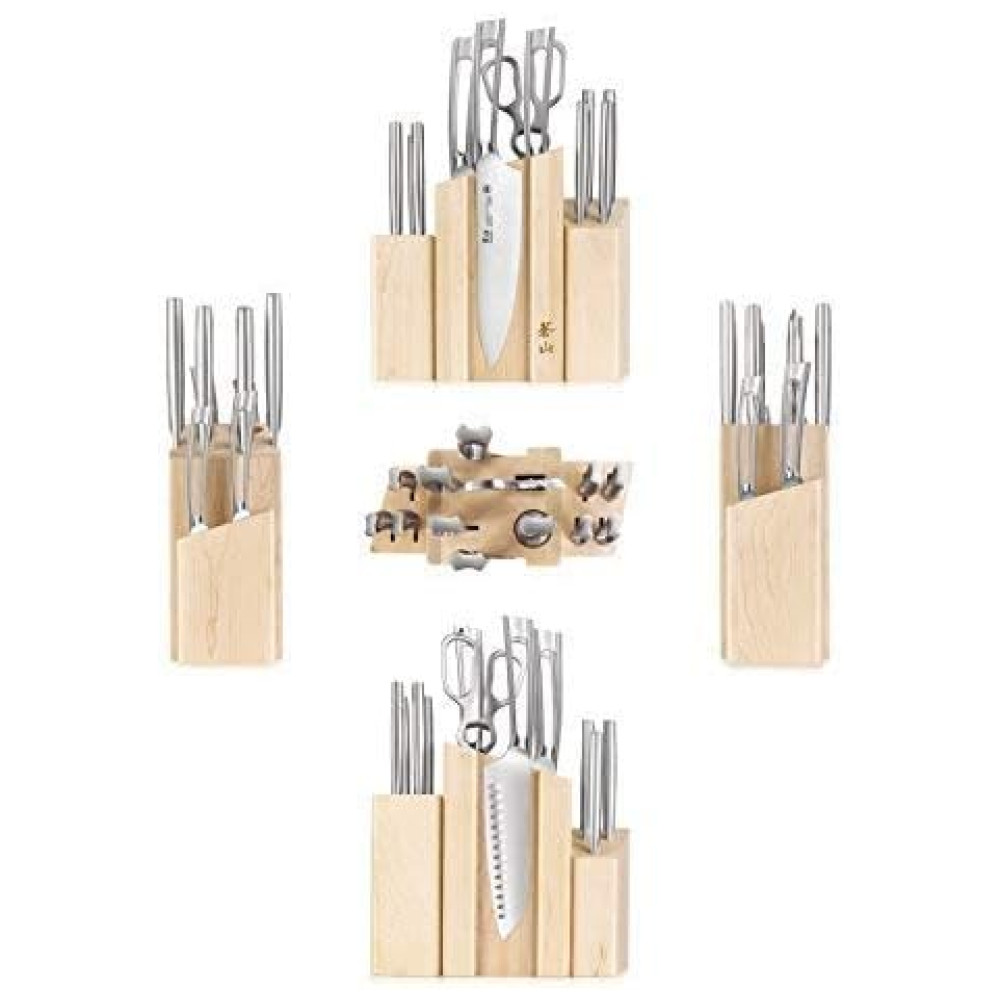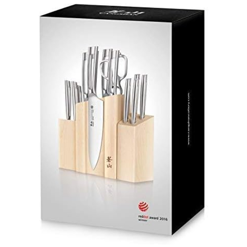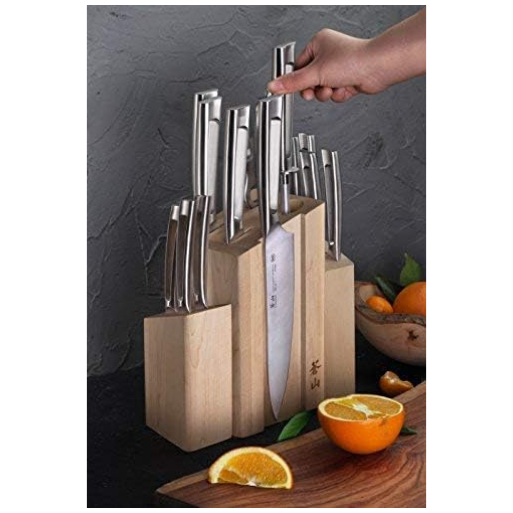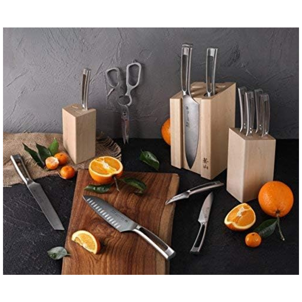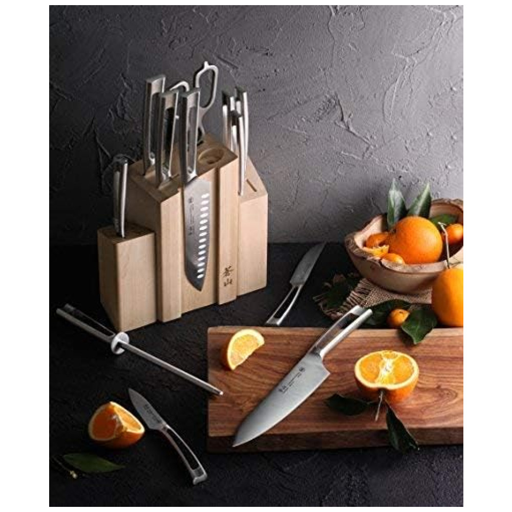 Forjadas completas em aço sueco Sandvik 14C28N de alta liga com nitidez excepcional, retêm uma borda até 5 vezes mais do que o aço alemão X50Cr15MoV RedDot 2016 Award patenteado com foco em design exclusivo em toda a estrutura metálica e alça de acabamento mate. 14 Peças. Bloco de madeira maciça trabalha com bom gosto as facas, com 3 peças separadas firmemente ancoradas por ímãs fortes, o usuário pode mover livremente suas facas essenciais para perto da ação. Série TN1 A Série TN1 contrasta sua beleza sutil com uma lâmina afiada de ponta reta. A faca toda forjada em metal tem um acabamento fosco que fornece resistência superior para durabilidade excepcional. Um design minimalista e elegante com alça oca garante que essas facas sejam confortáveis e esteticamente agradáveis. Cada faca é bem equilibrada e perfeitamente trabalhada, permitindo o uso pesado da cozinha e a limpeza fácil. Materiais de primeira qualidade