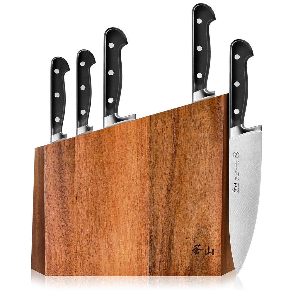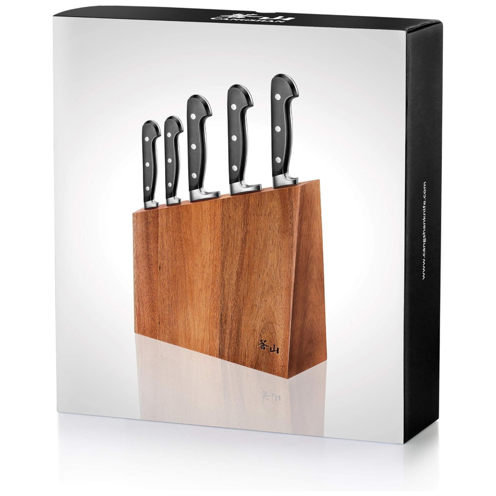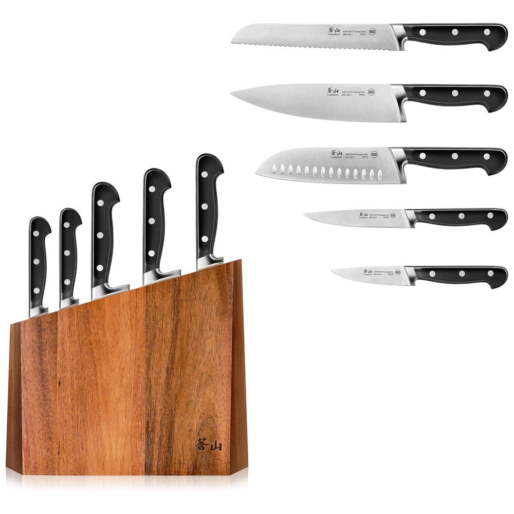Cangshan é uma marca de calibre profissional de facas de cozinha, dedicada a combinar os melhores pontos fortes, qualidades e beleza das facas de estilo ocidental e oriental. Nossa paixão é projetar e fabricar facas distintas, práticas e impressionantes que durarão nos próximos anos. Criamos facas únicas que os chefs profissionais podem ficar empolgados e orgulhosos de usar o bloco de madeira de acácia sólido projetado com tecnologia de ponta e com patente pendente funciona com as facas com bom gosto, cada bloco é feito à mão e tem seu próprio grão X50Cr15MoV German Steel com HRC 58 , 2 na escala de dureza Rockwell o conjunto de facas de 6 peças inclui o chef de 8 polegadas, o Santoku de 7 polegadas, o pão de 8 polegadas e o utilitário serrilhado de 5 polegadas. Bloco de facas de acácia sólido de 5 slots 10 1, 16 L x 3 6, 16 de W x 11 9, 16 de H polegadas Aprovado pela National Sanitation Foundation NSF