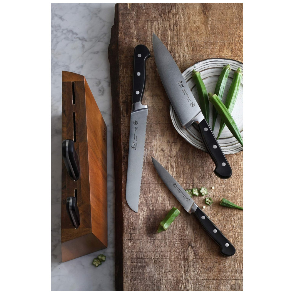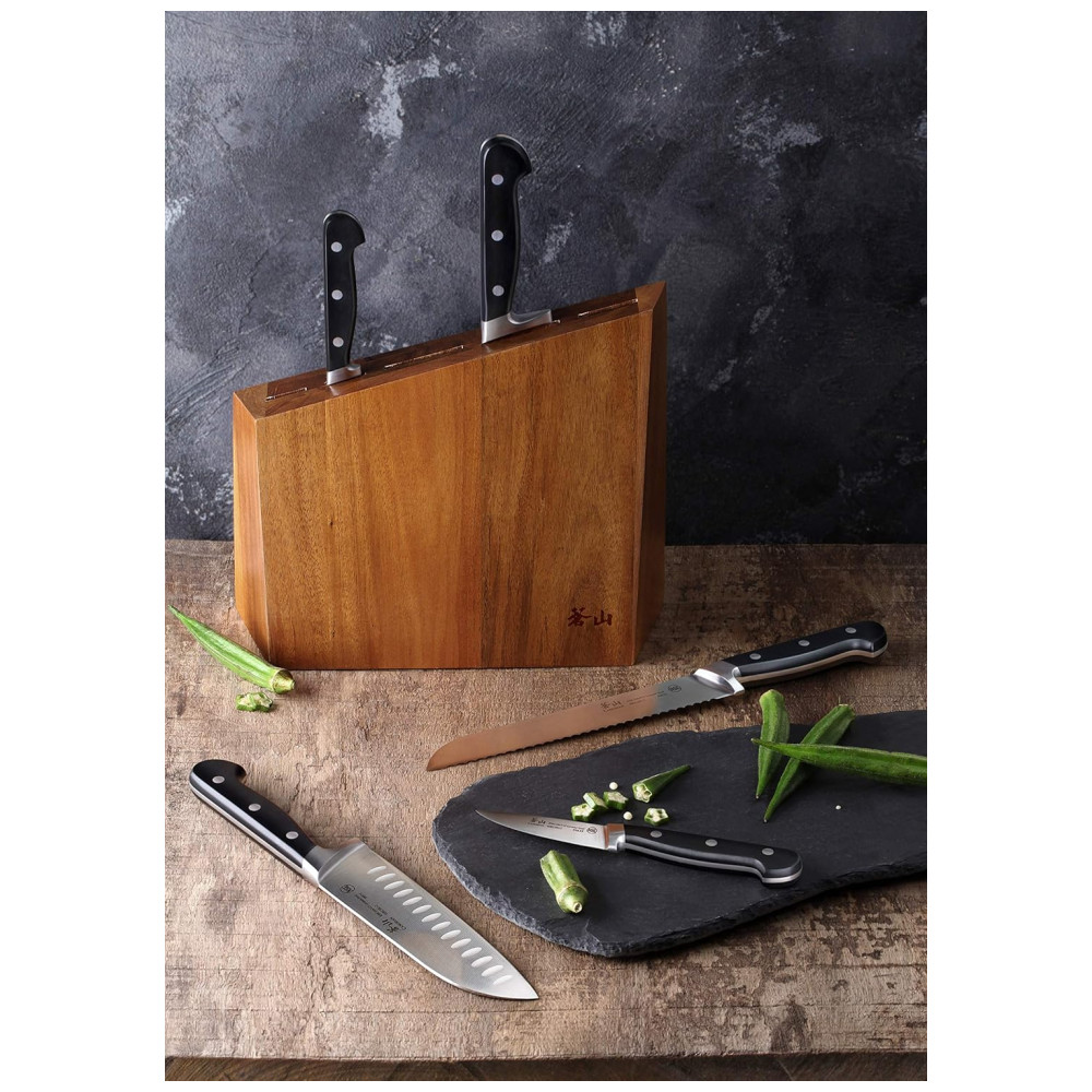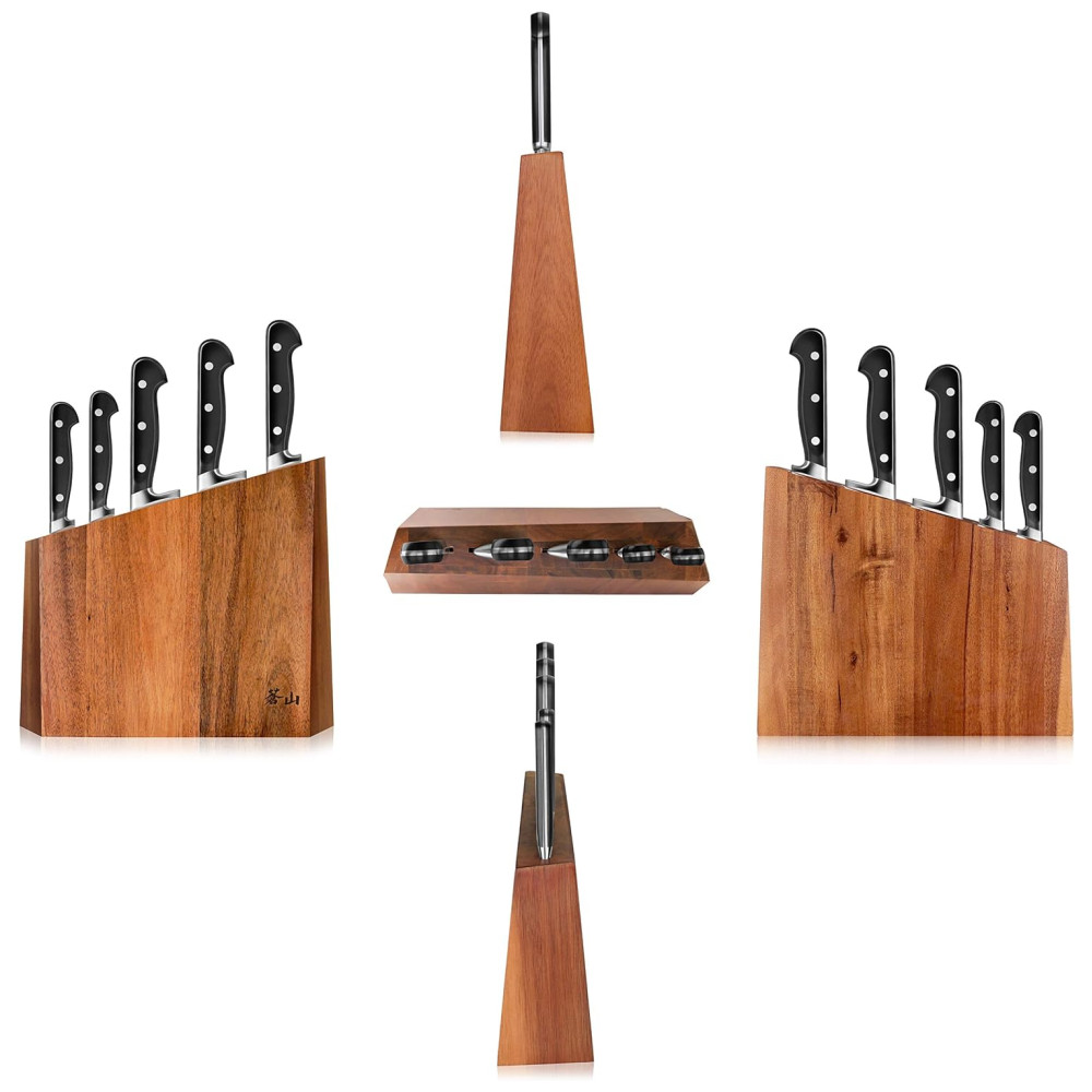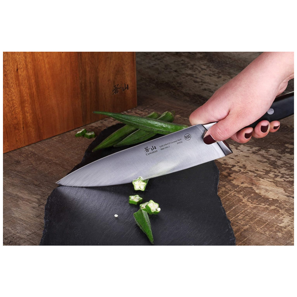 Cangshan é uma marca de calibre profissional de facas de cozinha, dedicada a combinar os melhores pontos fortes, qualidades e beleza das facas de estilo ocidental e oriental. Nossa paixão é projetar e fabricar facas distintas, práticas e impressionantes que durarão nos próximos anos. Criamos facas únicas que os chefs profissionais podem ficar empolgados e orgulhosos de usar o bloco de madeira de acácia sólido projetado com tecnologia de ponta e com patente pendente funciona com as facas com bom gosto, cada bloco é feito à mão e tem seu próprio grão X50Cr15MoV German Steel com HRC 58 , 2 na escala de dureza Rockwell o conjunto de facas de 6 peças inclui o chef de 8 polegadas, o Santoku de 7 polegadas, o pão de 8 polegadas e o utilitário serrilhado de 5 polegadas. Bloco de facas de acácia sólido de 5 slots 10 1, 16 L x 3 6, 16 de W x 11 9, 16 de H polegadas Aprovado pela National Sanitation Foundation NSF