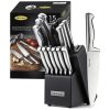 Facas de design patenteadas, que se concentram na ergonomia, para uma aderência fácil e confortável Inclui 8 Peças Forjada a partir de aço alemão X50Cr15MoV com HRC 58 , 2 na Rockwell Escala de dureza Faca de espiga completa oferece resistência superior, a borda de afiação cônica permanece nítida e fácil de afiar novamente Certificado pela National Sanitation Foundation NSF, garantia vitalícia contra defeitos do fabricante.