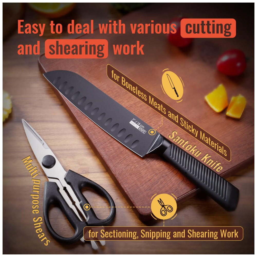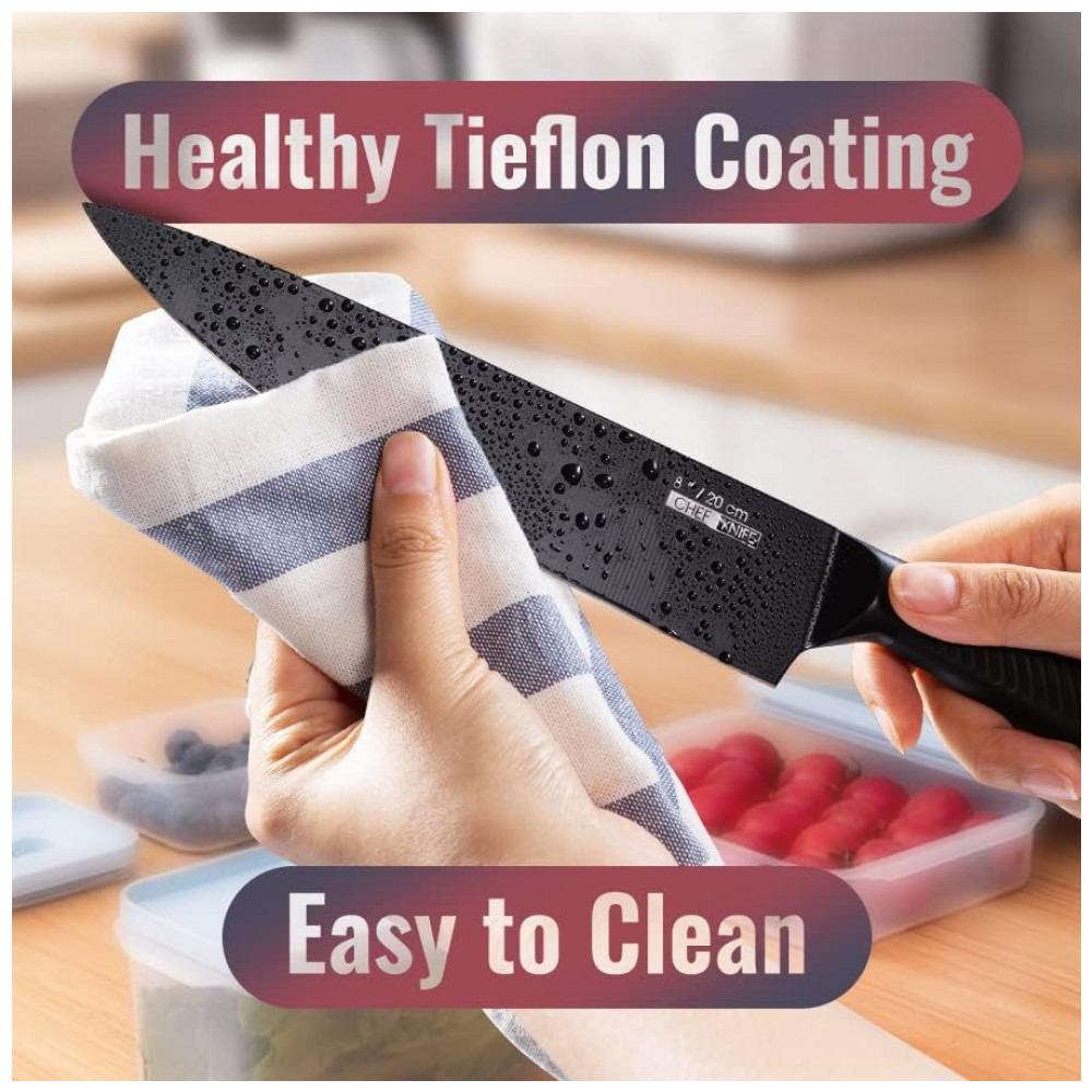 Lâminas de aço inoxidável de alto carbono Graças à nossa tecnologia autônoma de fabricação de aço desenvolvimento para facas, torna mais fácil ficar afiado. Você pode fazer tudo por um longo tempo, desde fatiar, picar, cortar em cubos, tudo sem esforço. Ângulos de lâmina de 15 permitiram cortes finos como papel que eram consistentes do início ao fim, mesmo em um tomate escorregadio