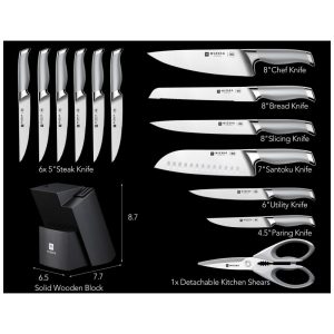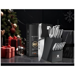 Conjunto de Facas WIZEKA em Aço Inoxidável Alemão com Bloco de Bancada Multinível 15 Peças Prata