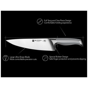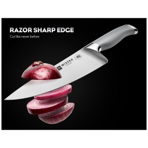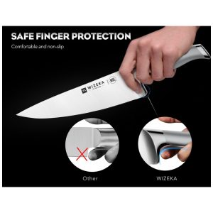 Design profissional A lâmina alemã de largura arredondada é especialmente projetada para americanos, para os quais é mais adequada de usar do que uma lâmina reta regular. Este conjunto de facas é definitivamente ideal para balançar, cortar, fatiar ou picar alimentos