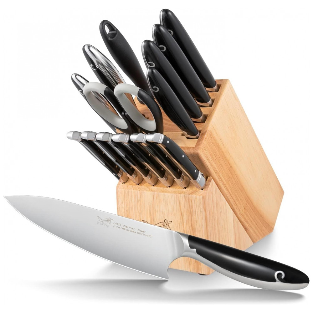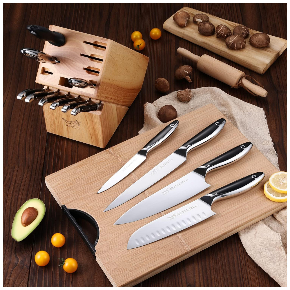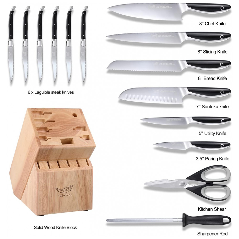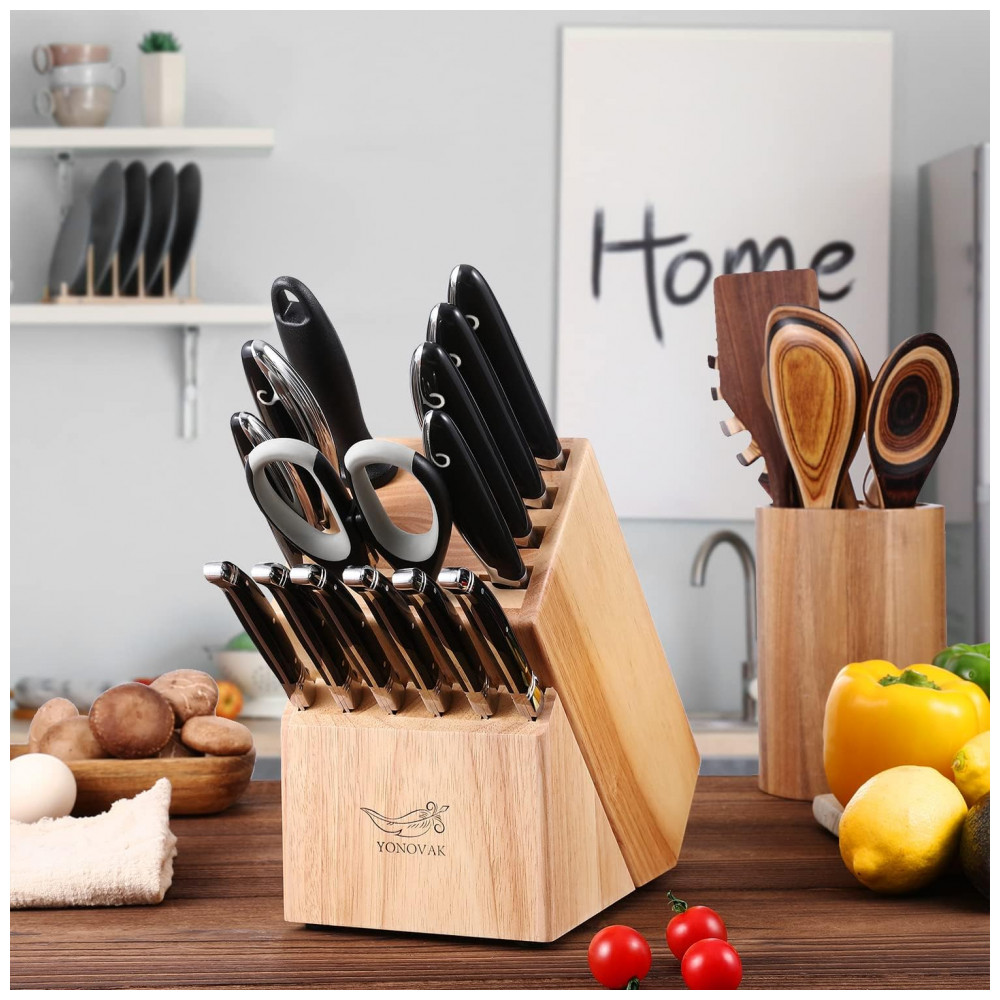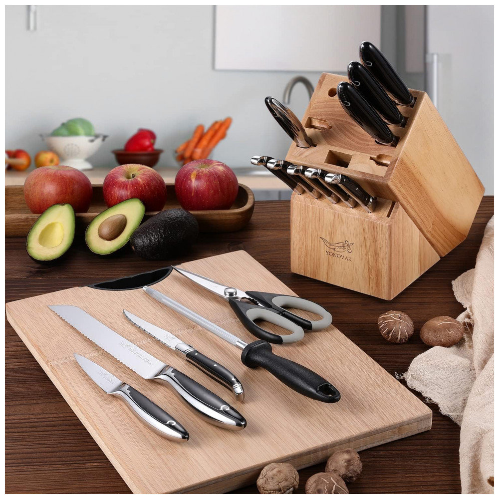 Conjunto de Facas YONOVAK em Aço Alemão com Bloco de Bancada Multinível 15 Peças Preta