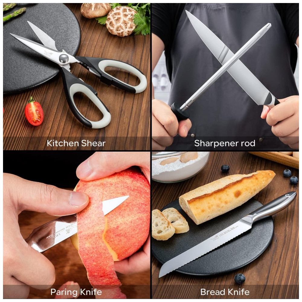 Nenhuma técnica de corte é necessária As lâminas de 16 polidas à mão tornam as facas mais duráveis e afiadas, permitindo que você domine sem esforço a espessura e a linha de corte dos ingredientes cortados e obtenha a quantidade perfeita de ingredientes que deseja