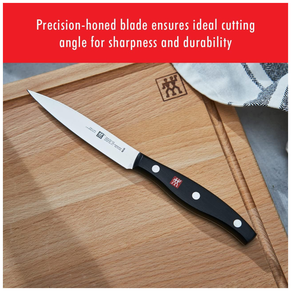 As facas Twin Signature da ZWILLING são produzidas com precisão a partir de uma única peça de aço alemão, resultando em facas mais leves que não comprometem a afiação. Feitas de aço especial patenteado, aperfeiçoado ao longo de 280 anos, essas lâminas FRIODUR, combinadas com a técnica de endurecimento por gelo da ZWILLING, são mais duras, mais afiadas, não mancham, não lascam e mantêm a afiação por mais tempo. As alças com três rebites embutidos com o logo da ZWILLING J.A. Henckels oferecem durabilidade máxima. As facas ZWILLING ultra afiadas começam cortantes e permanecem afiadas por mais tempo. Com 57 Rockwell Hardness, excelente retenção de borda e ângulo de 15 graus por lado, este conjunto é ideal para qualquer cozinha. Construídas para durar, as facas ZWILLING são o resultado de quase 300 anos de experiência em fabricação de facas. Ergonomicamente projetadas para conforto máximo, estas facas equilibram força e precisão. O conjunto inclui: Faca de Desossa de 4 polegadas, Faca Utilitária Serrilhada de 5 polegadas, Faca do Chef de 8 polegadas, Tesoura de Cozinha, Aço de Afiar de 9 polegadas e Bloco de Madeira com 10 Slots.