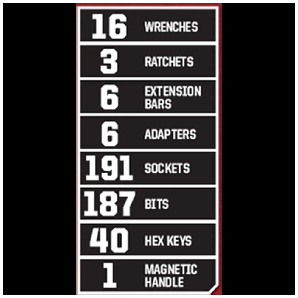 191 encaixes, 6 pontos, 8 pontos e 12 pontos, tanto em polegadas quanto em tamanhos métricos