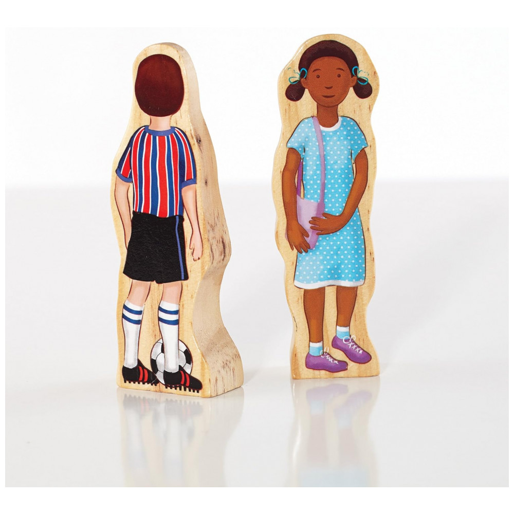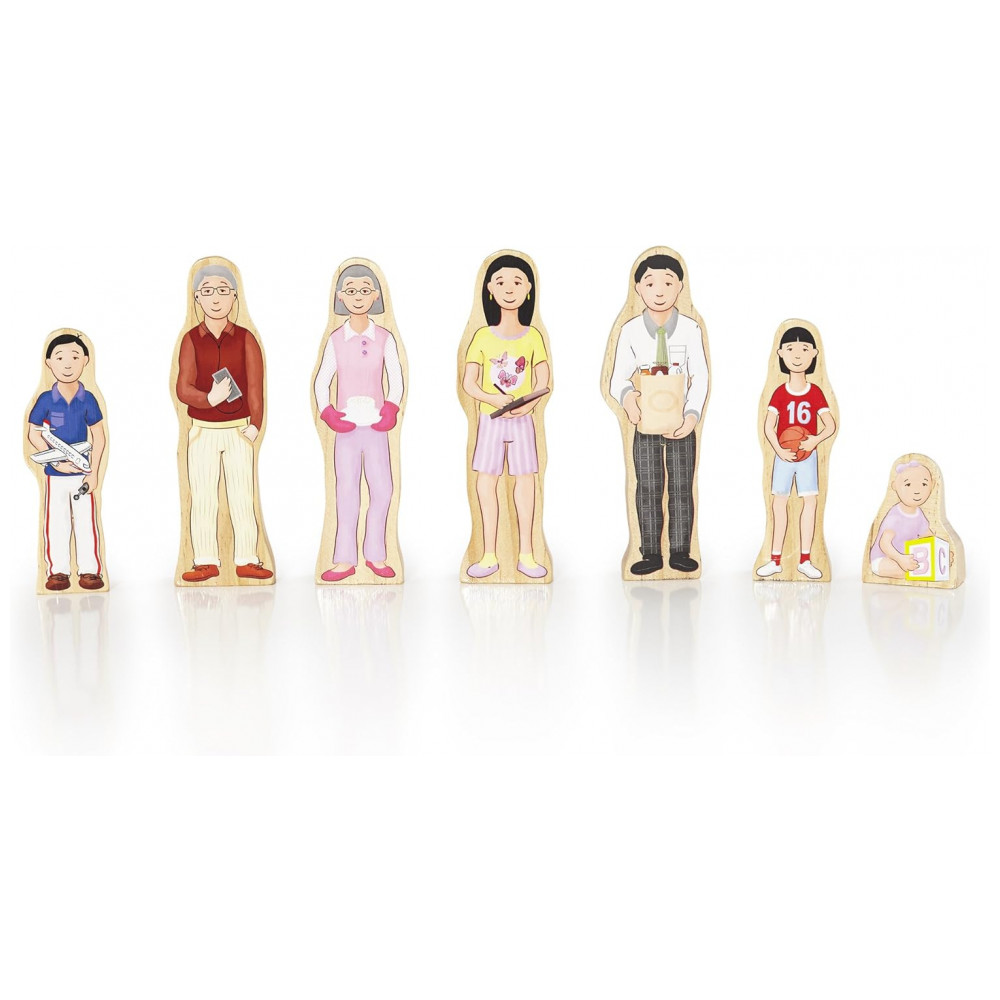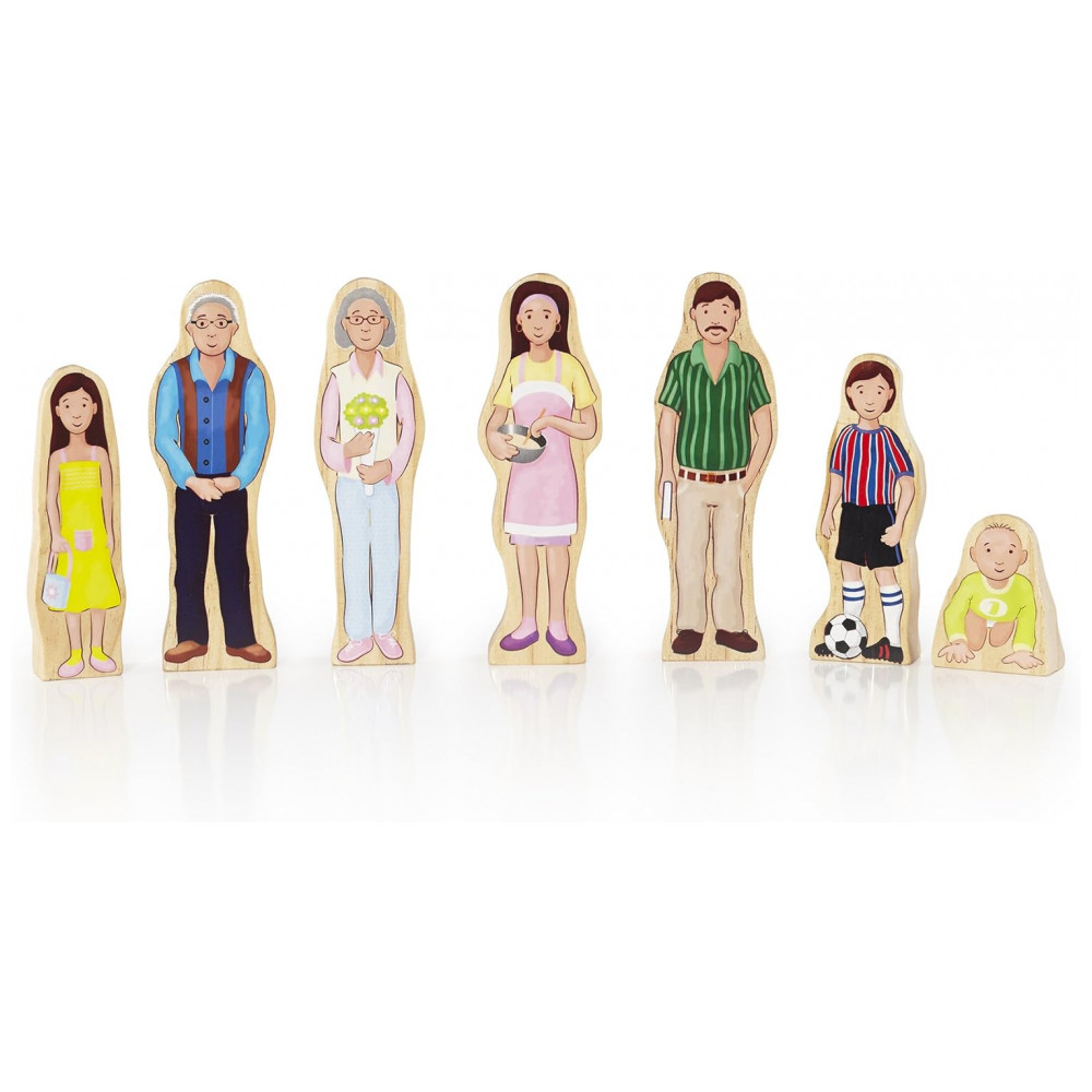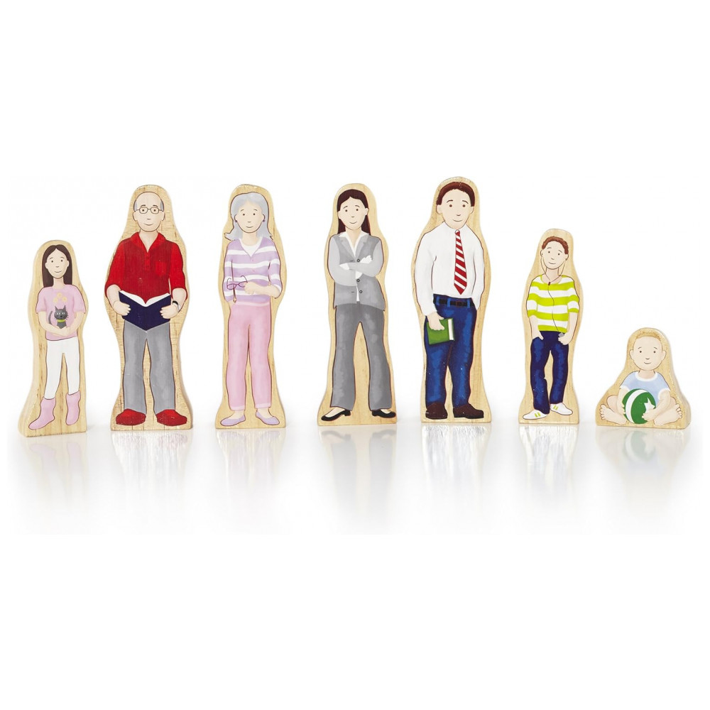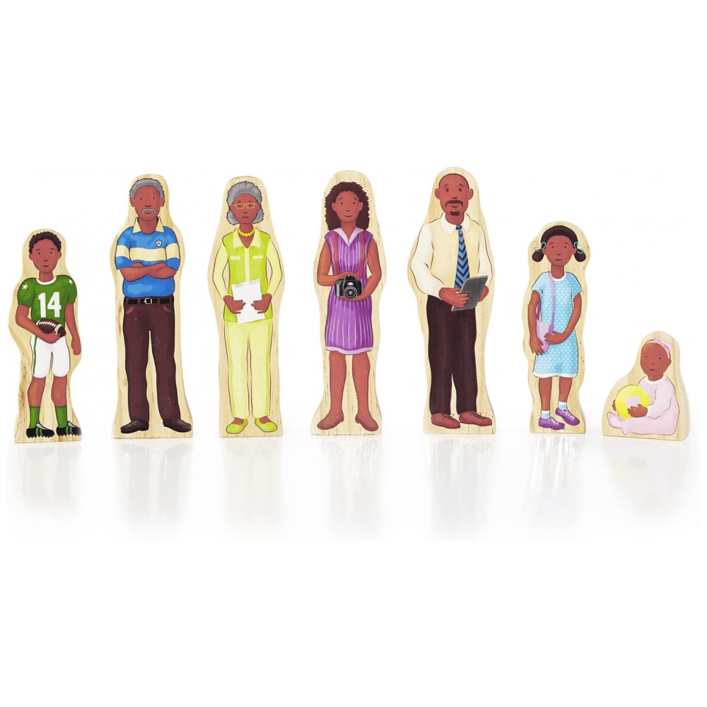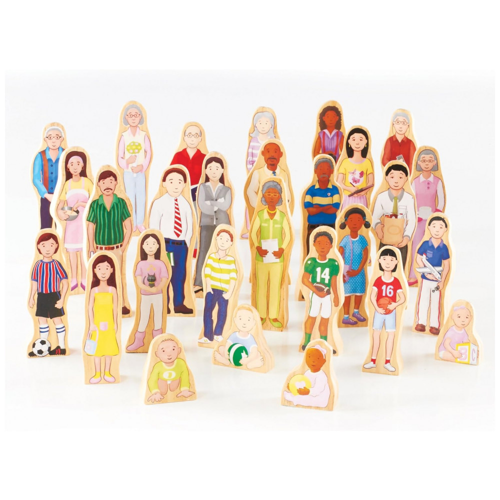 Conjunto de personagens em madeira maciça para brincadeiras de faz de conta e uso em conjunto com blocos de construção, indicado para crianças a partir de 2 anos. As peças representam famílias de diferentes origens étnicas, incluindo grupos afro-americanos, caucasianos, hispânicos e asiáticos, apoiando conversas sobre diversidade, identidade e convivência em sala de aula ou em casa.