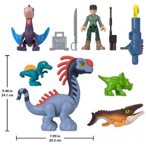 Conteúdo da embalagem: 1 figura humana, 5 dinossauros, 1 lançador, 1 projétil e 3 acessórios de rastreamento