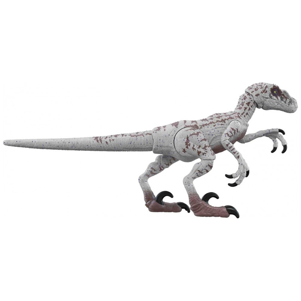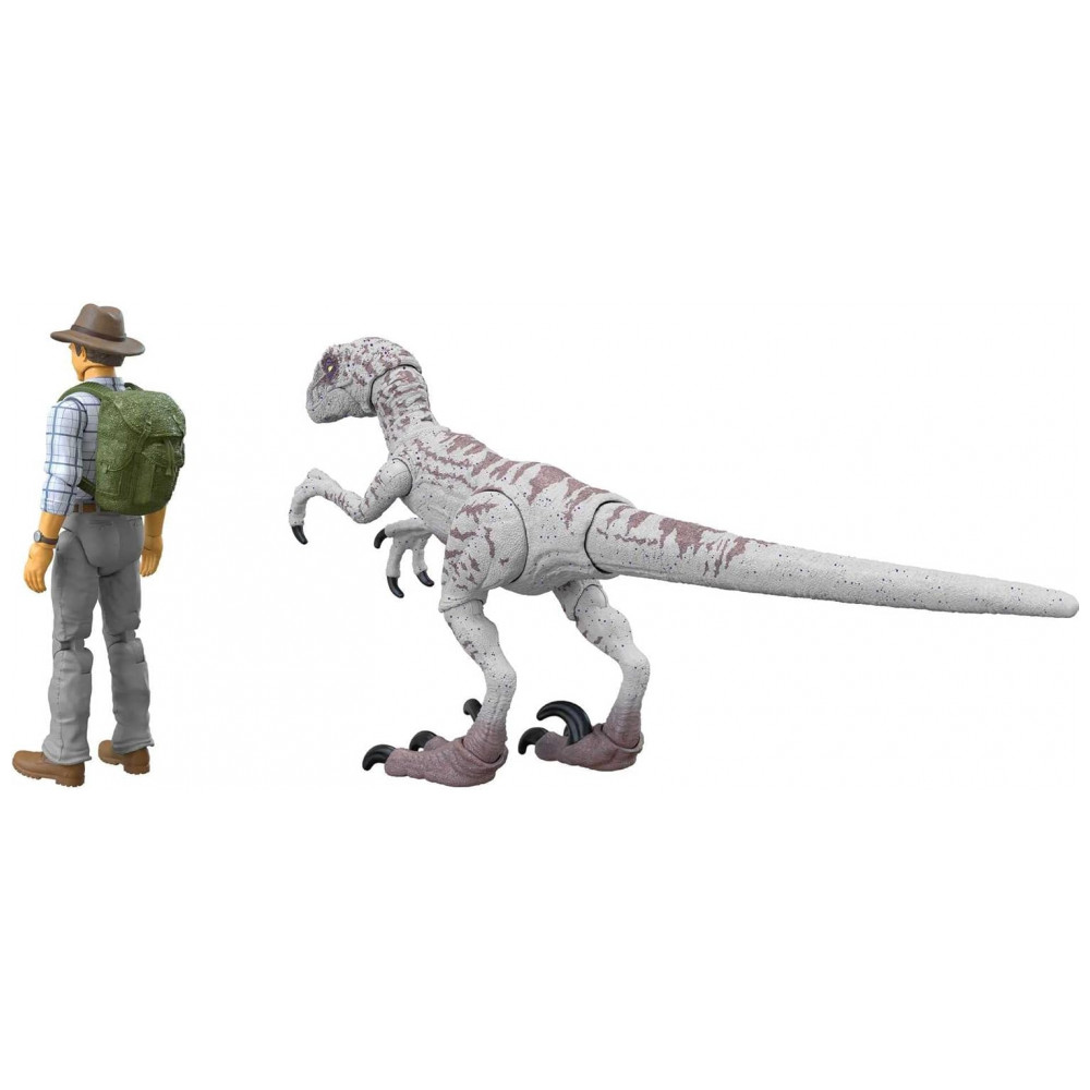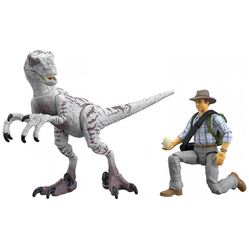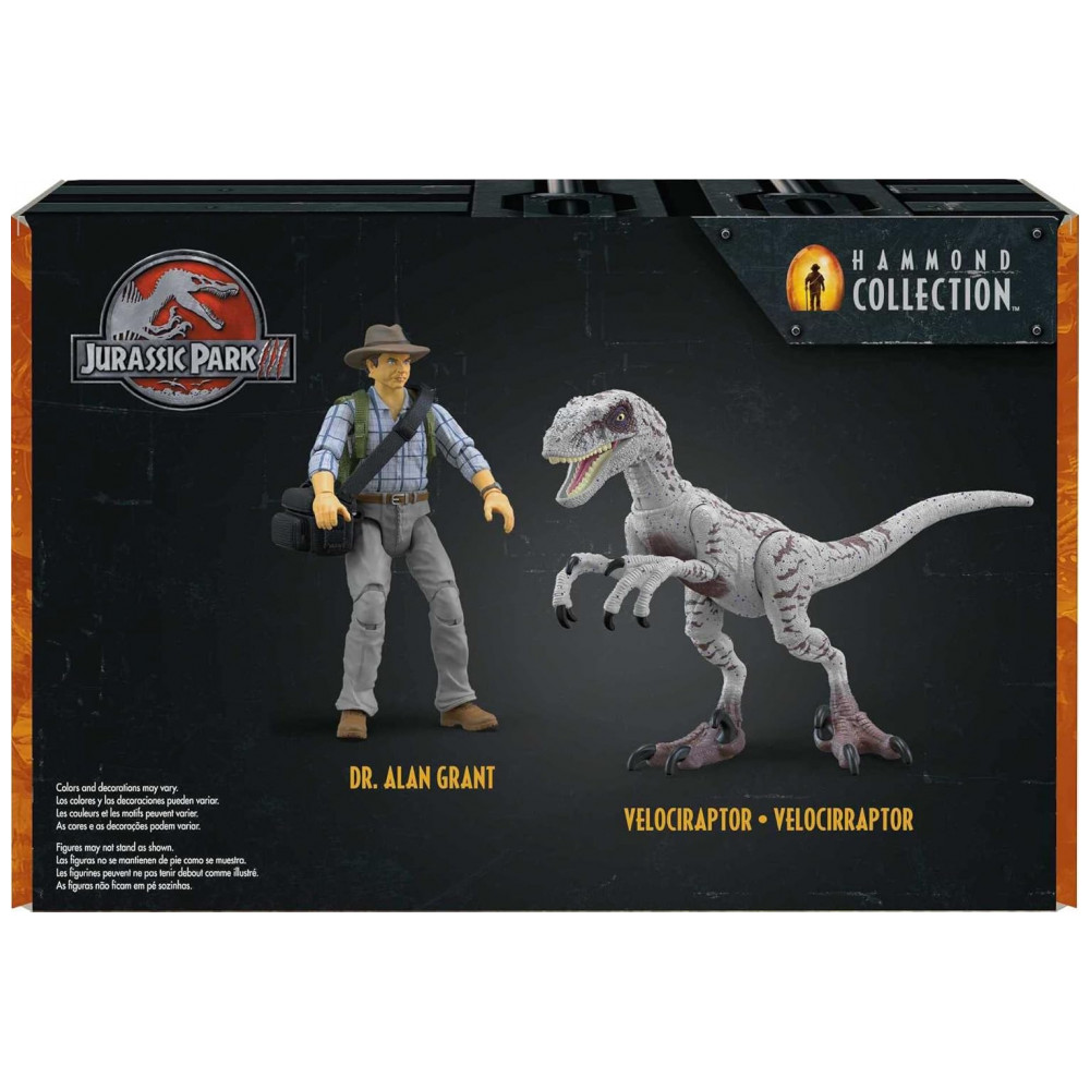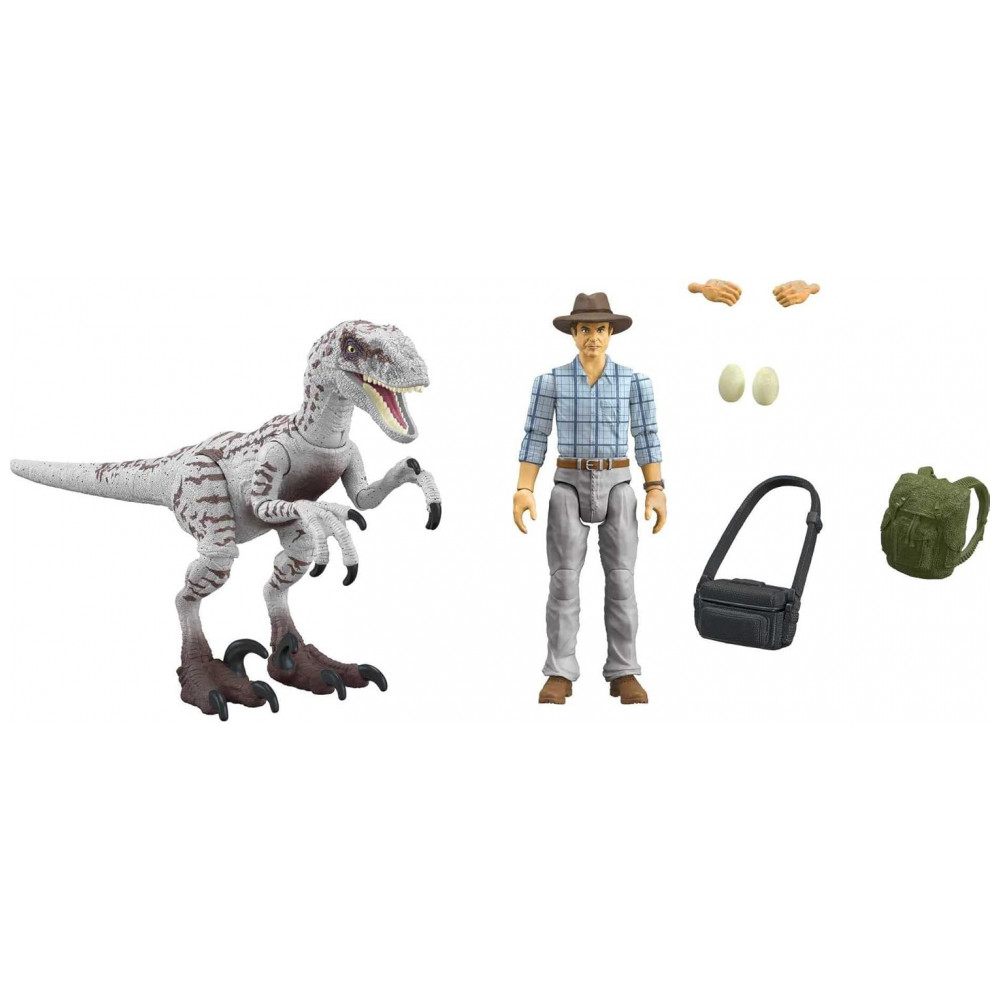 A figura do Dr. Alan Grant vem com camisa xadrez, chapéu safari, mochila verde, bolsa de transporte e dois ovos de raptor removíveis, além de par de mãos extras para segurar acessórios. O Velociraptor fêmea apresenta articulações múltiplas e pintura inspirada no visual do filme Jurassic Park III.