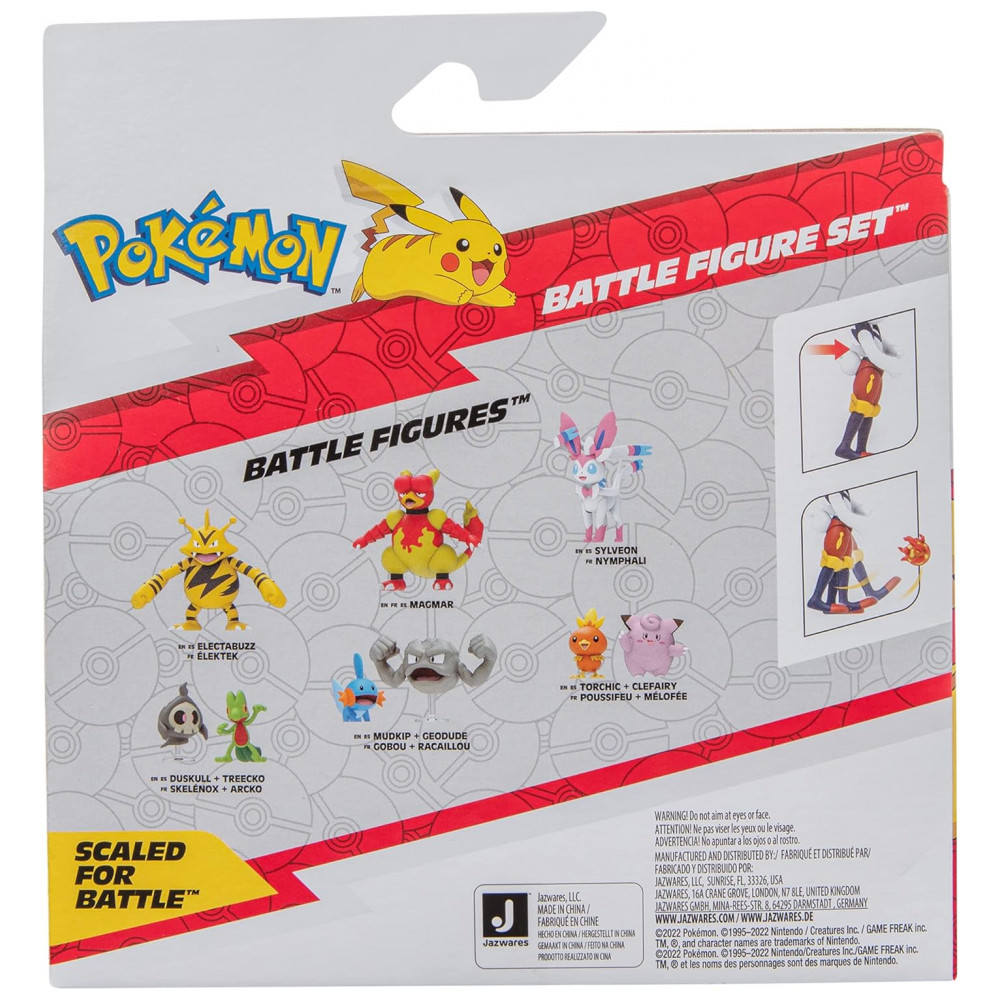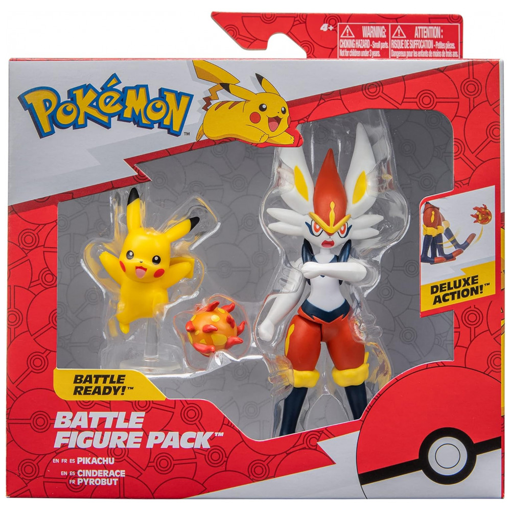 O Pokémon Battle Figure 2 Pack é um conjunto de figuras de ação que reúne o personagem Cinderace em versão articulada, acompanhado de um acessório em formato de bola de fogo inspirada em seus chutes, e uma figura do Pikachu em pose fixa de batalha. As figuras têm visual detalhado, com cores e traços fiéis à aparência dos personagens na série animada Pokémon, sendo indicadas tanto para brincadeiras quanto para colecionadores.