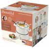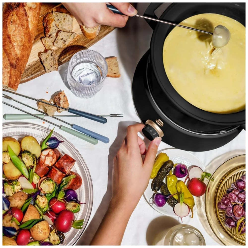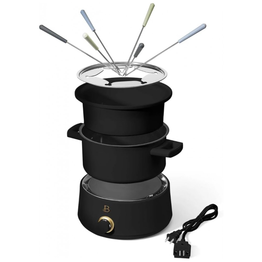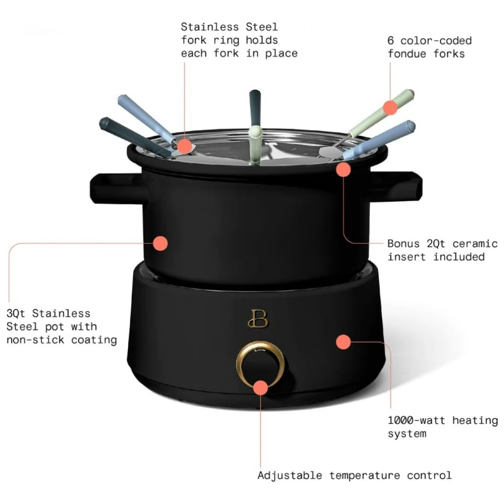 Conjunto de fondue elétrico da linha Beautiful by Drew Barrymore com panela principal em aço inox de 3L e panela adicional em cerâmica de 2L, indicado para fondues de queijo, chocolate, caldos e preparos à base de óleo. A base aquecedora elétrica de 1000W possui controle de temperatura ajustável, permitindo selecionar o nível de aquecimento adequado para manter o fondue derretido e homogêneo durante toda a refeição.