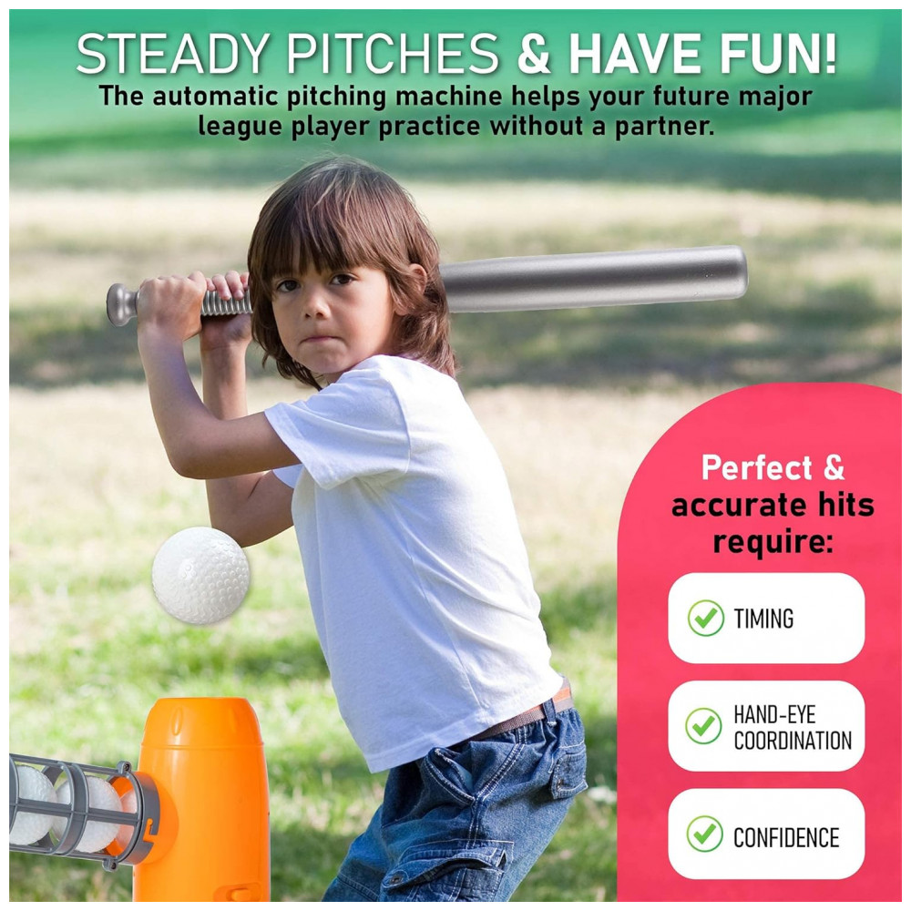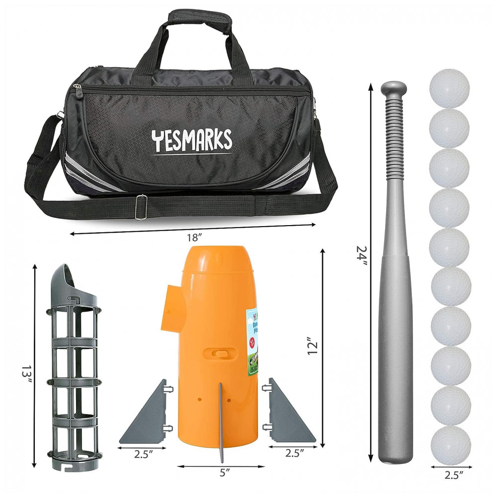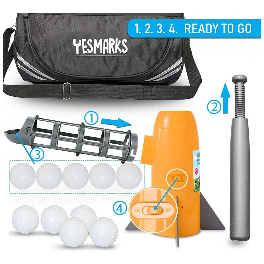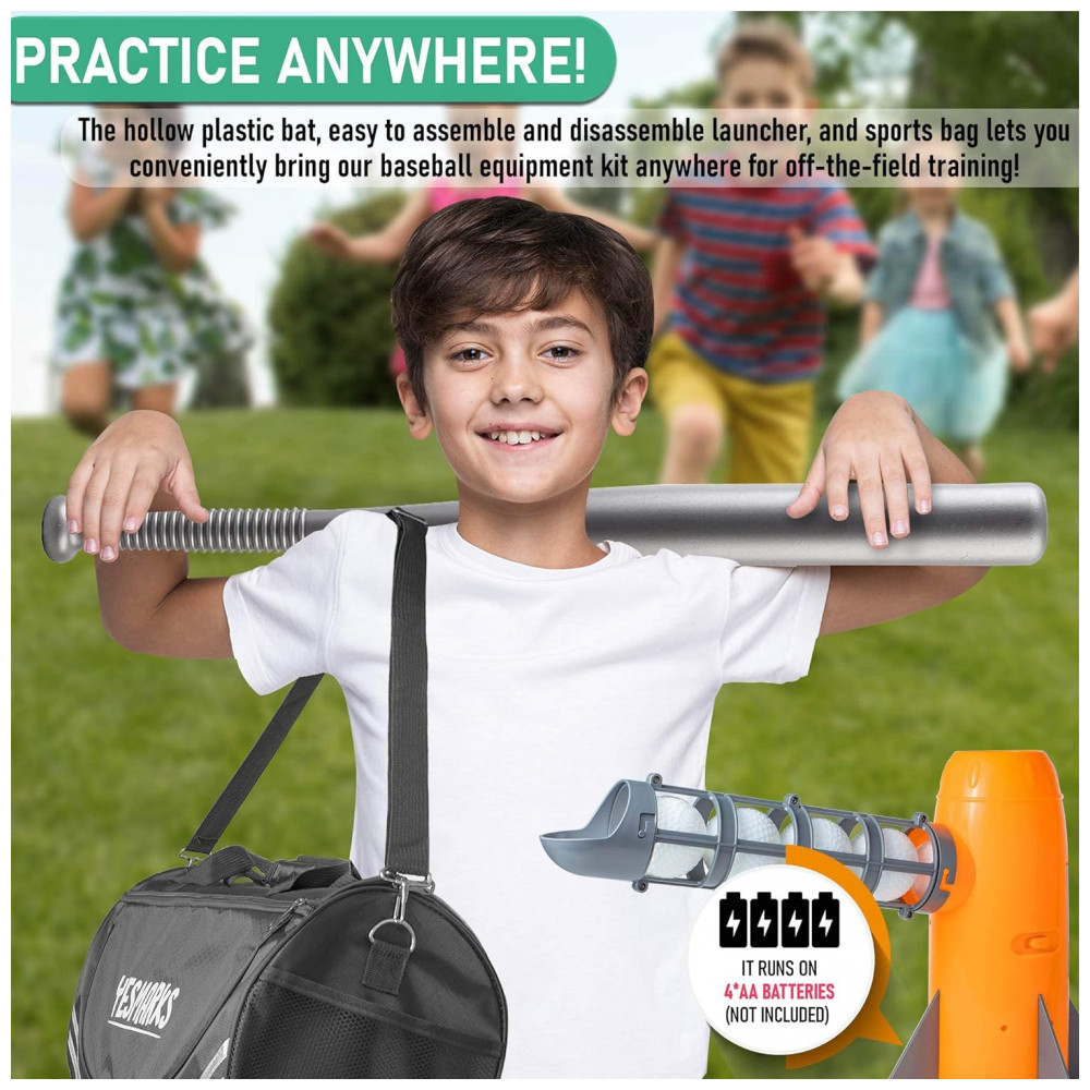EQUIPAMENTO COMPLETO DE TREINAMENTO DE BEISEBOL O conjunto inclui 1 máquina de arremesso automático em forma de foguete, 1 taco de beisebol de plástico leve, 10 bolas PP e 1 bolsa esportiva de luxo para zenamento e transporte. Funciona com 4 pilhas AA não inclusas. PRATICAR EM QUALQUER LUGAR O taco de plástico oco, o lançador fácil de montar e desmontar e a bolsa esportiva permitem que você leve convenientemente nosso kit de equipamento de beisebol para qualquer lugar para treinamento fora do campo BOLAS DE BACKUP INCLUÍDAS Também jogamos 5 bolas PP extras para um total de 10 bolas PP Com isso, você e seu filho passarão mais tempo rebatendo em vez de pegar bolas. Ter bolas de reserva também significa que você não precisa se preocupar em perder uma ou duas bolas durante o jogo.