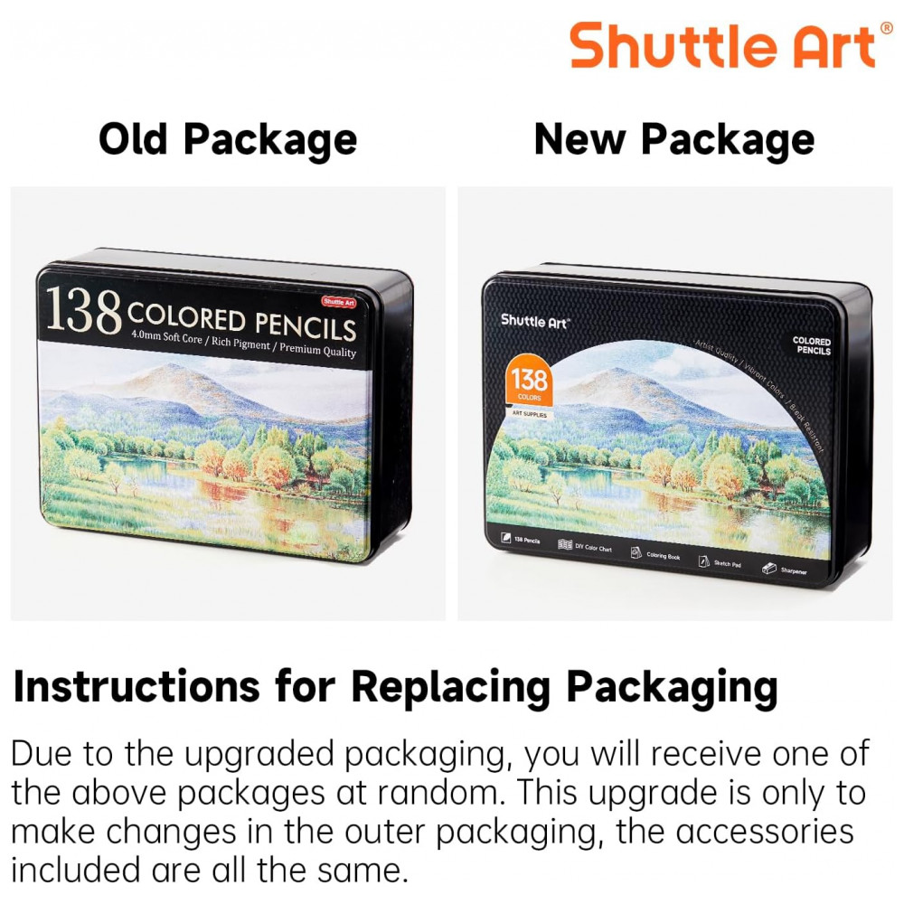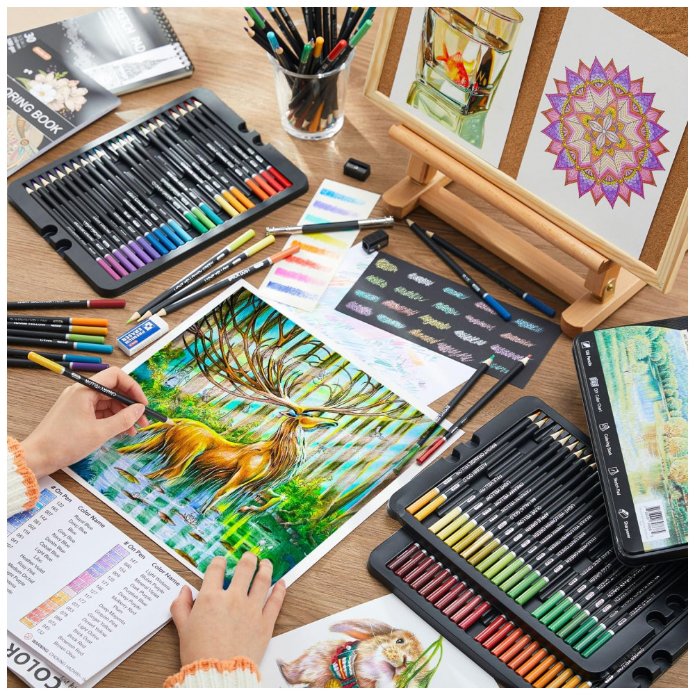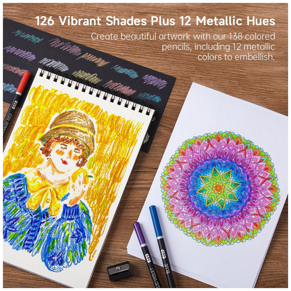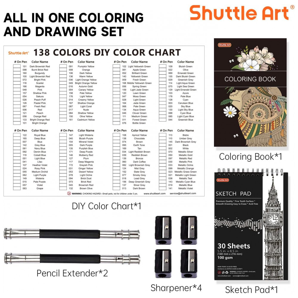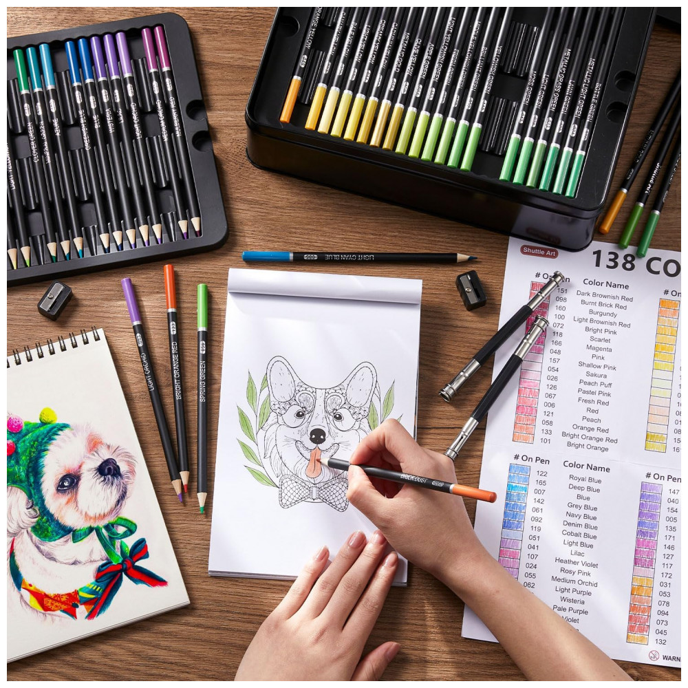 Conjunto de lápis de cor profissionais Shuttle Art 138 cores com núcleo macio acompanha 1 livro de colorir 1 bloco de esboços 4 apontadores 2 ext