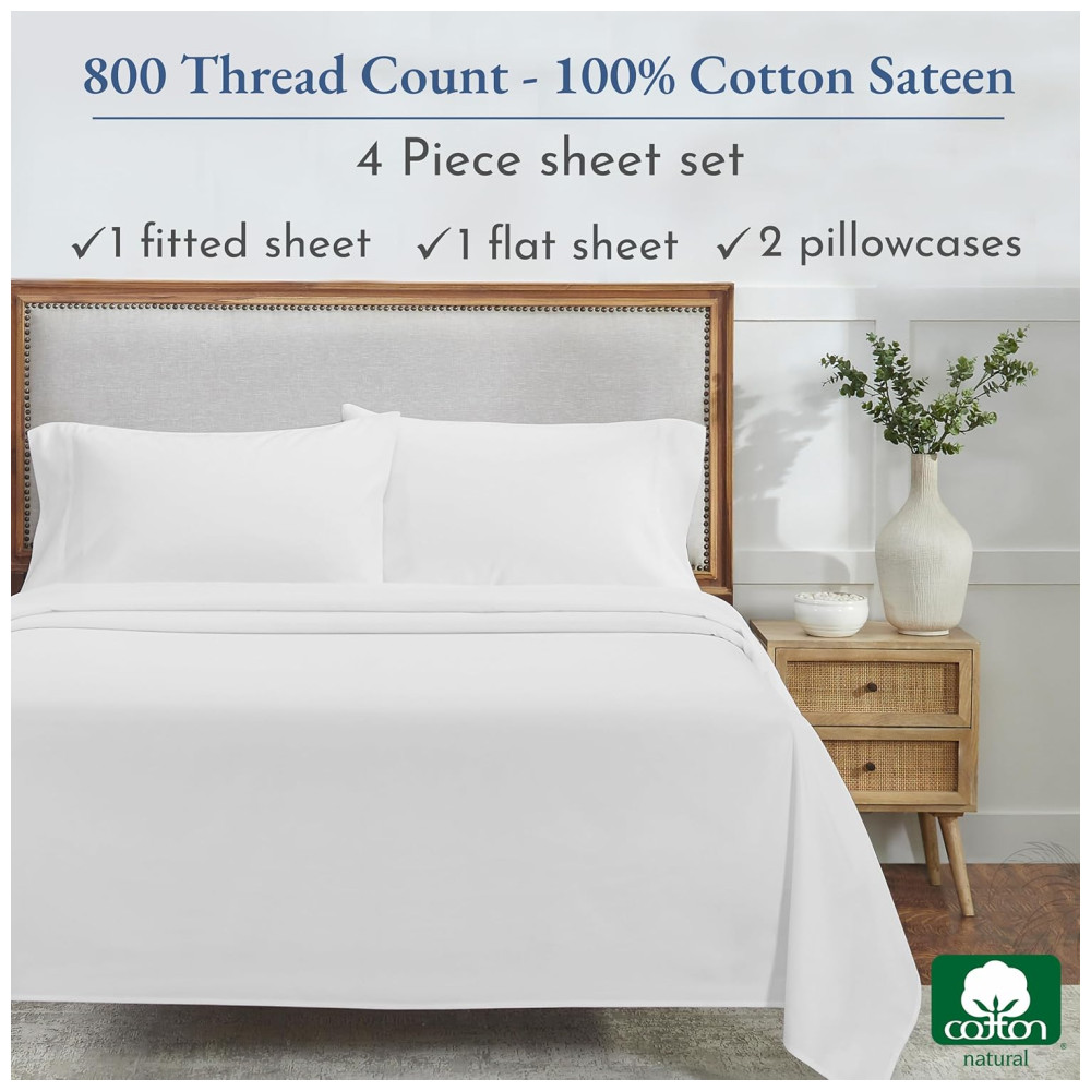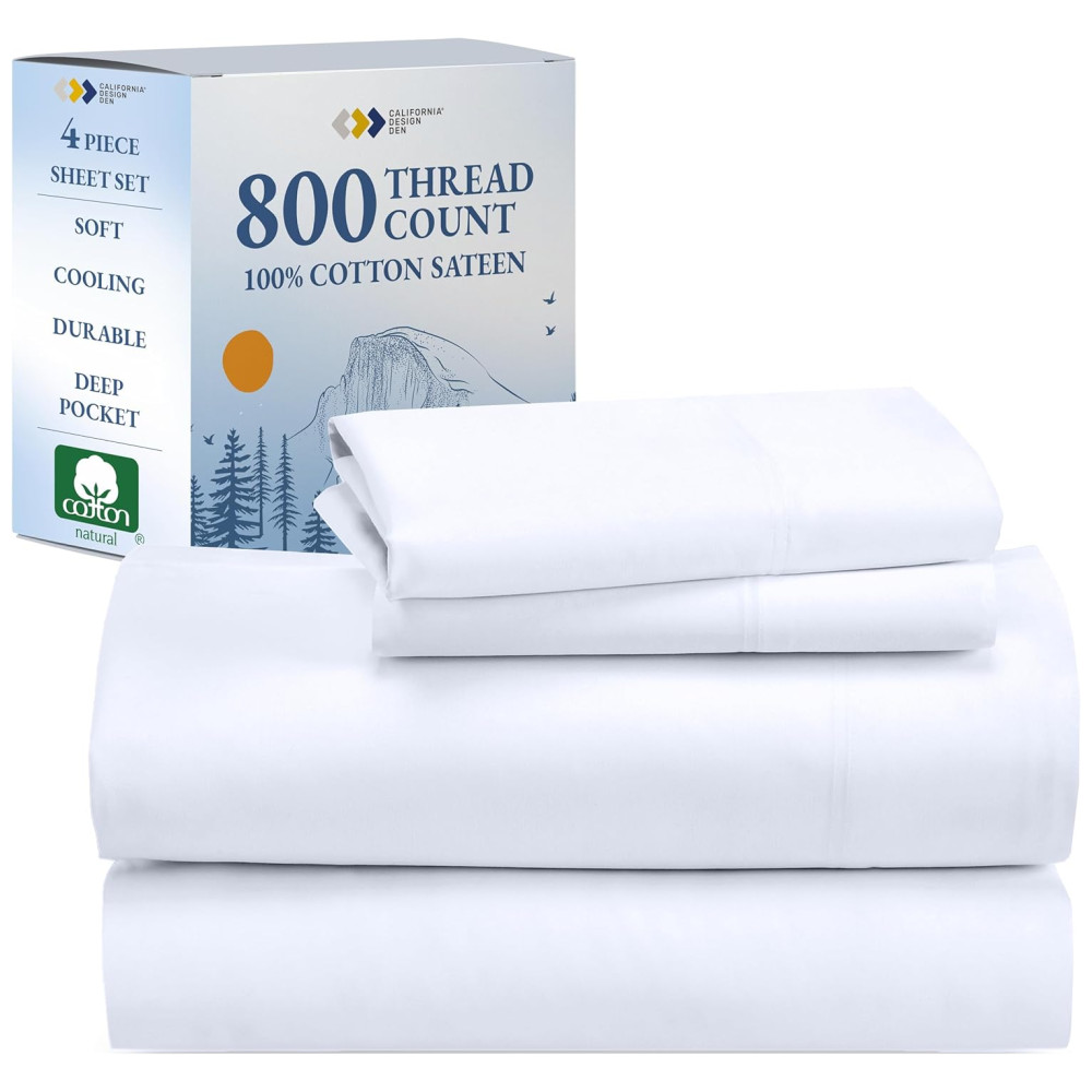 Conjunto de Lençóis de 800 Fios com Elástico Tamanho Queen Macio e Sedoso com Material 100% Algodão California Design Den Branco