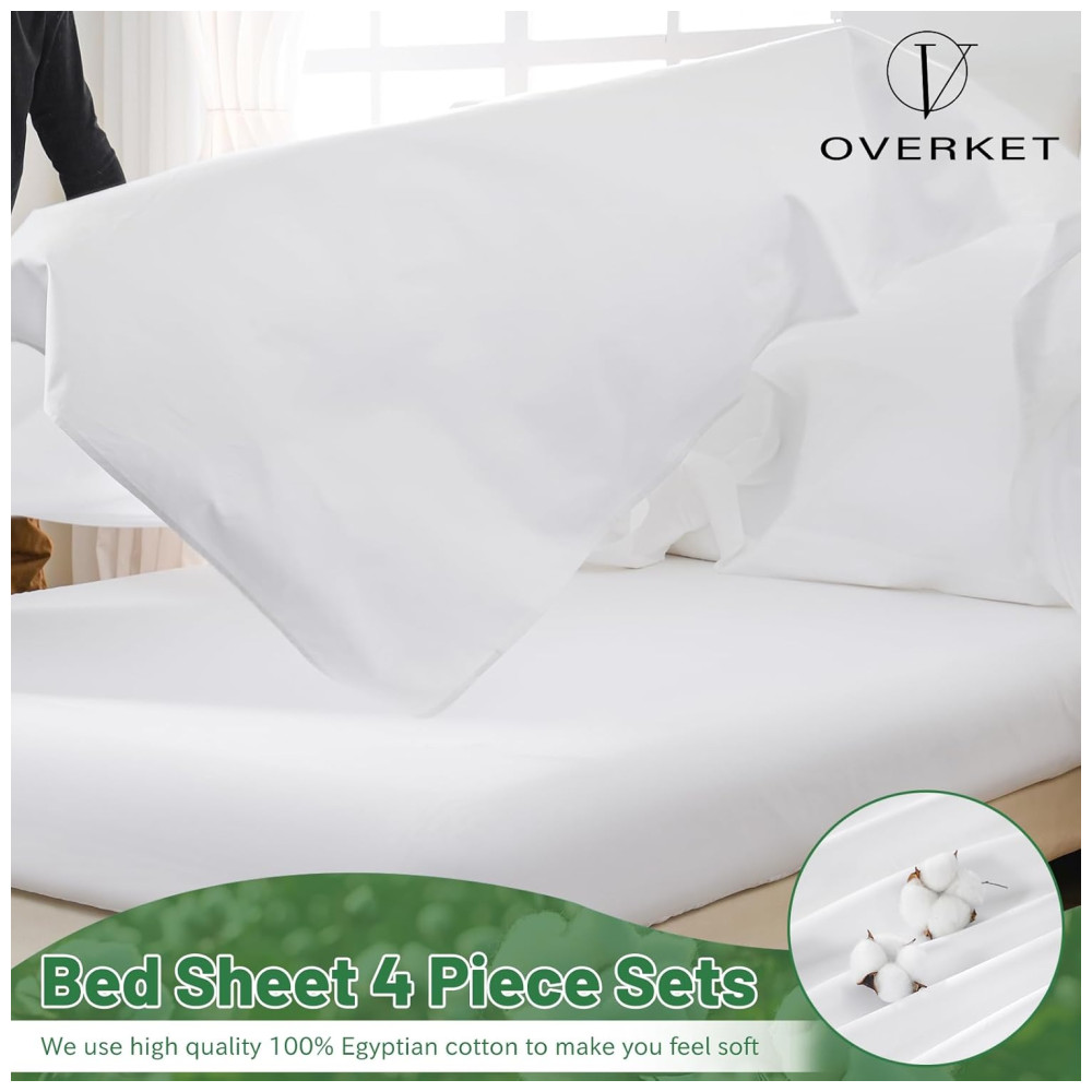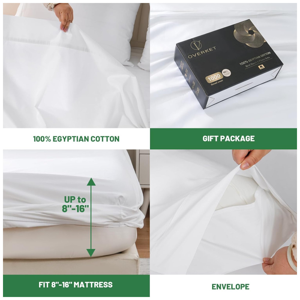 Conjunto de Lençóis em Algodão Egípcio de 1000 Fios Tamanho King para Todas as Estações Super Macio e Respirável Overket Branco