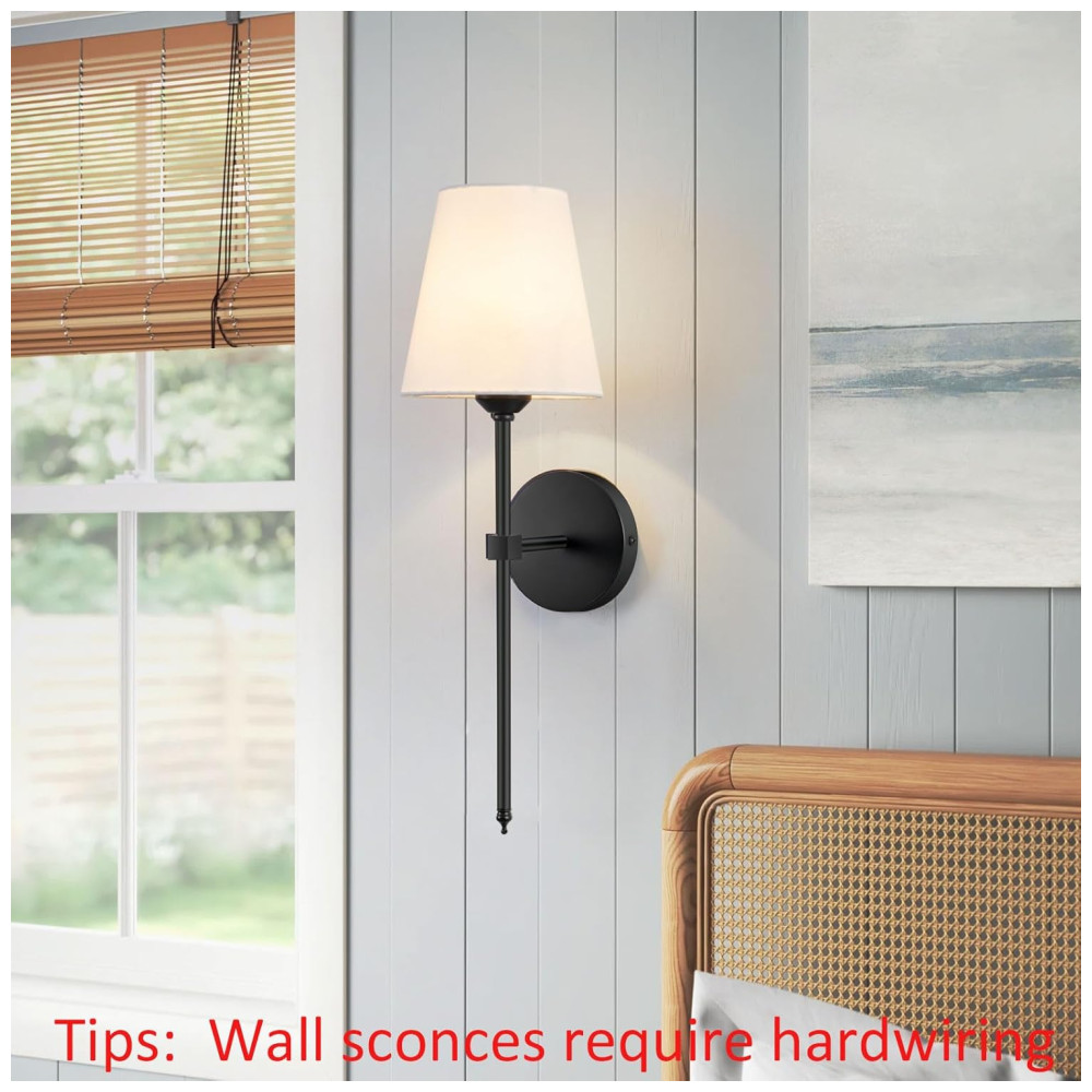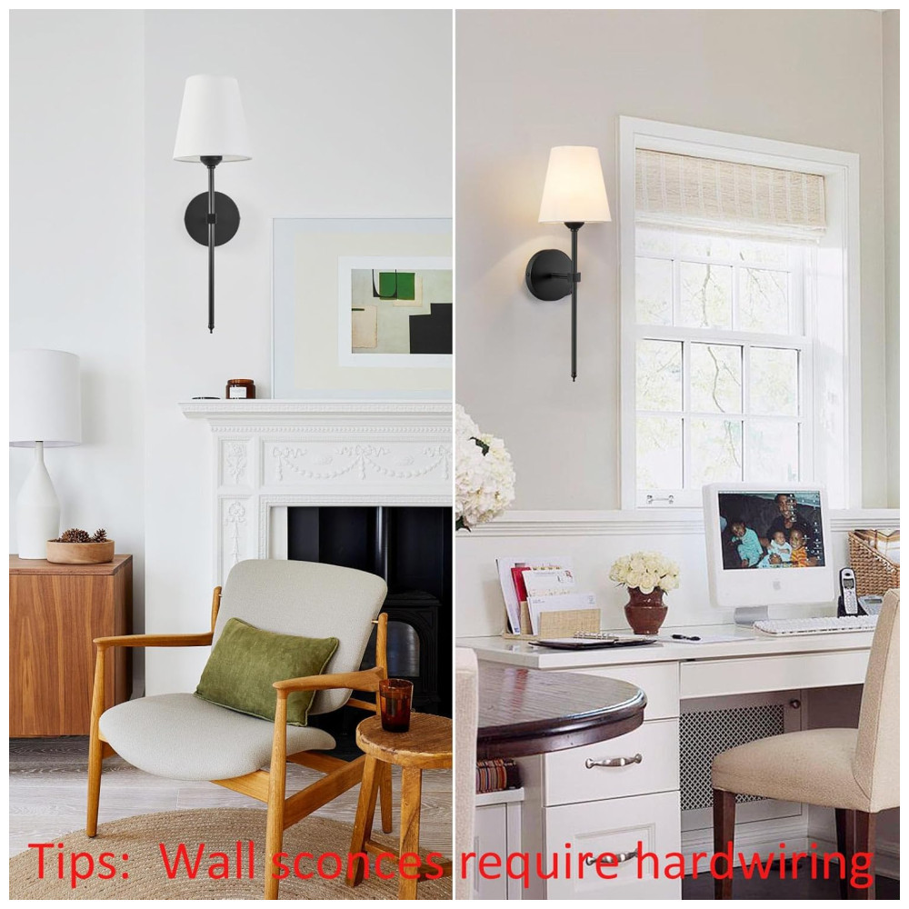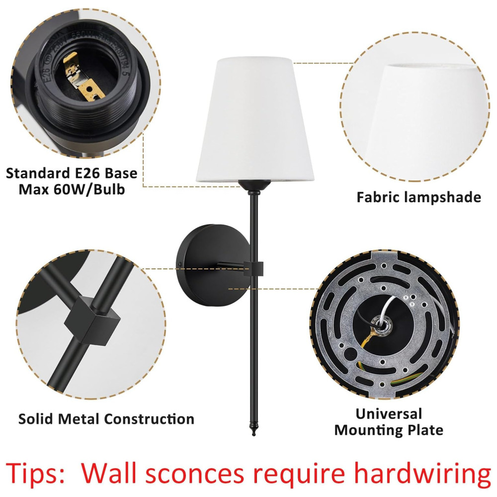 As arandelas possuem uma base de lâmpada E26 padrão, compatível com lâmpadas incandescentes, LED, CFL e halógenas (máximo de 60W). Vale ressaltar que a lâmpada não está incluída. O acabamento metálico preto clássico, o braço longo de coluna e o abajur de tecido branco criam uma atmosfera retrô e elegante, tornando-as uma excelente opção para quem deseja adicionar um toque de charme e sofisticação aos seus espaços internos.