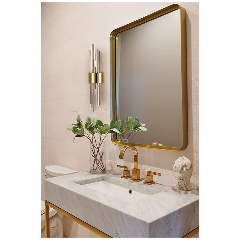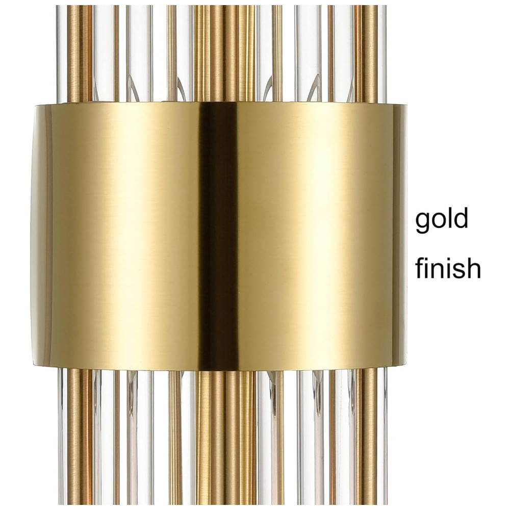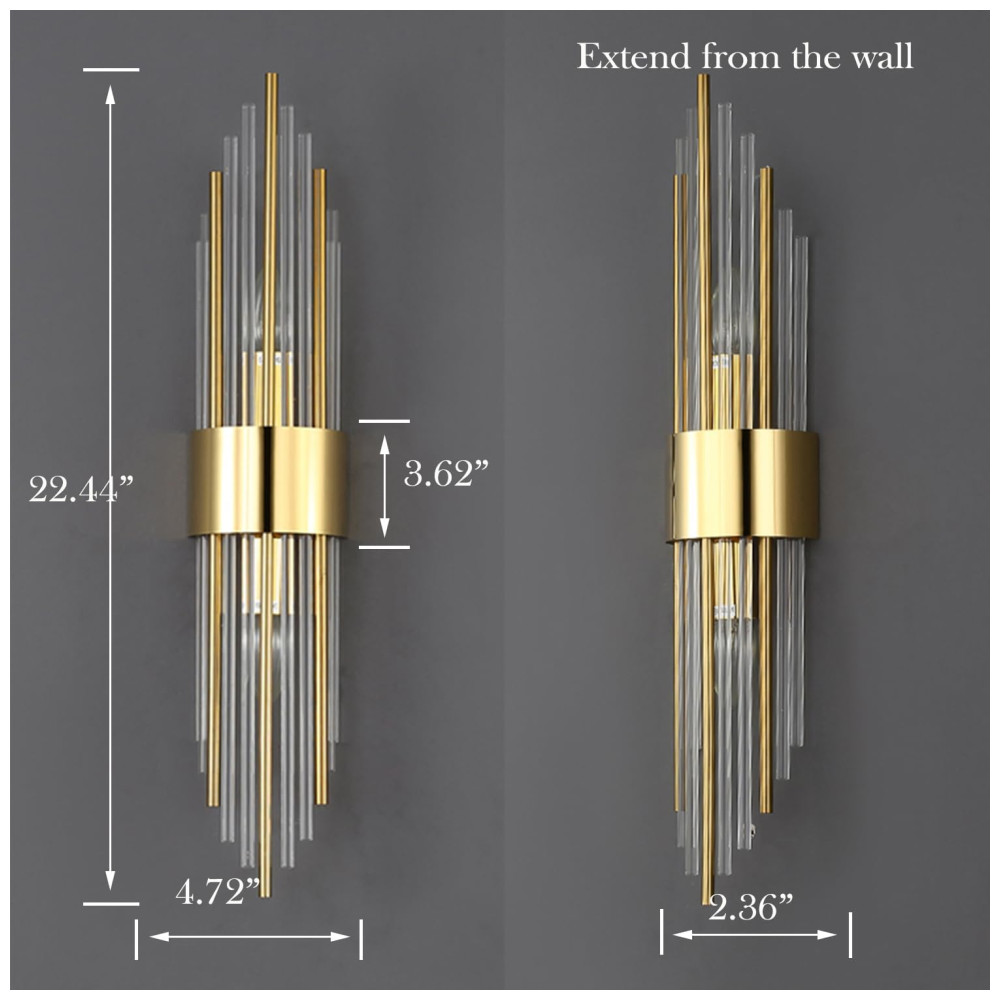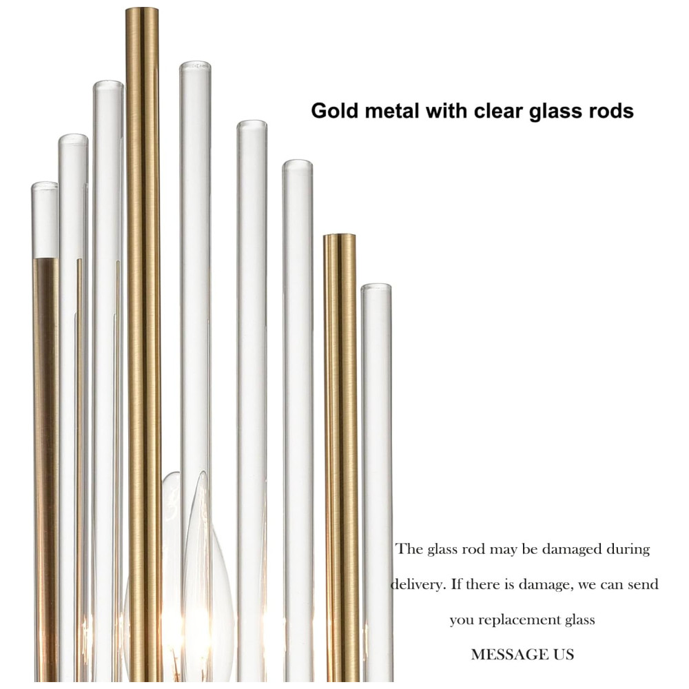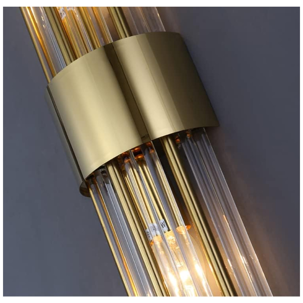 As hastes de vidro transparente podem ser ajustadas conforme suas necessidades, oferecendo maior flexibilidade na instalação. O suporte de parede é feito de aço inoxidável soldado e vidro cristal, com um design texturizado em metal dourado que exala brilho e elegância.