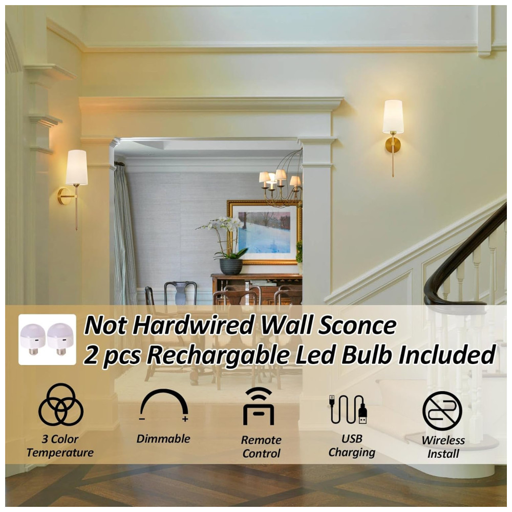 Este conjunto de luminárias de parede inclui duas lâmpadas alimentadas por bateria, cada uma equipada com lâmpada LED regulável e controle remoto. As lâmpadas são recarregáveis, e um cabo de carregamento USB Tipo C está incluso, garantindo conveniência e facilidade no uso.
