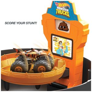 O lançador de impacto no início acomoda 2 carros Hot Wheels em escala 164 ou 1 Monster Truck, que podem ser lançados simultaneamente pela rampa e através de um anel de fogo para uma diversão enorme. As crianças podem marcar a façanha executando um giro e pousando no círculo dos vencedores, enquanto o placar dá um feedback imediato sobre suas habilidades
