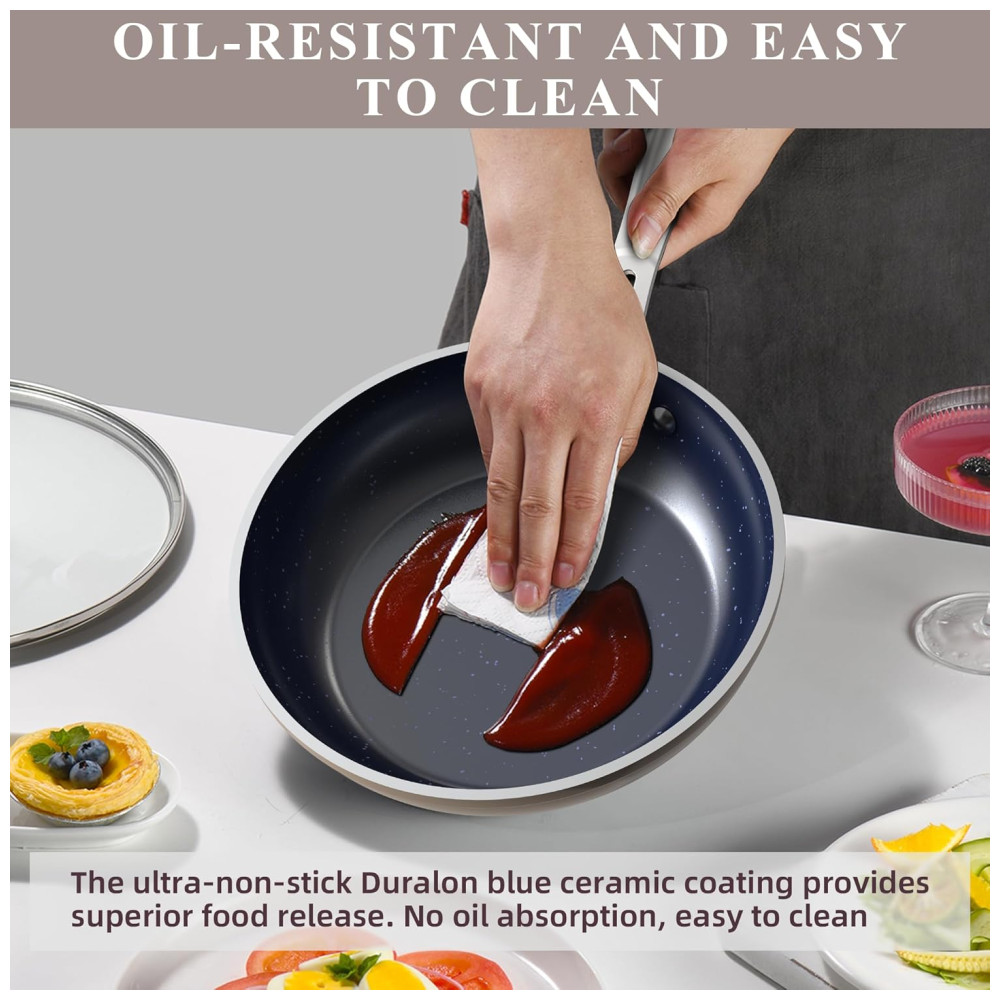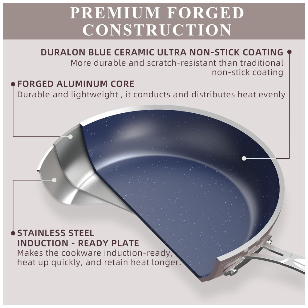 Este conjunto de panelas é construído com forjamento premium, tornando as fortes e duráveis, mas leves e fáceis de manusear. O revestimento cerâmico Duralon Blue é ecologicamente correto e ultraantiaderente, livre de produtos químicos nocivos como PTFE, PFOA, chumbo e cádmio, e não emite gases tóxicos em temperaturas mais altas.