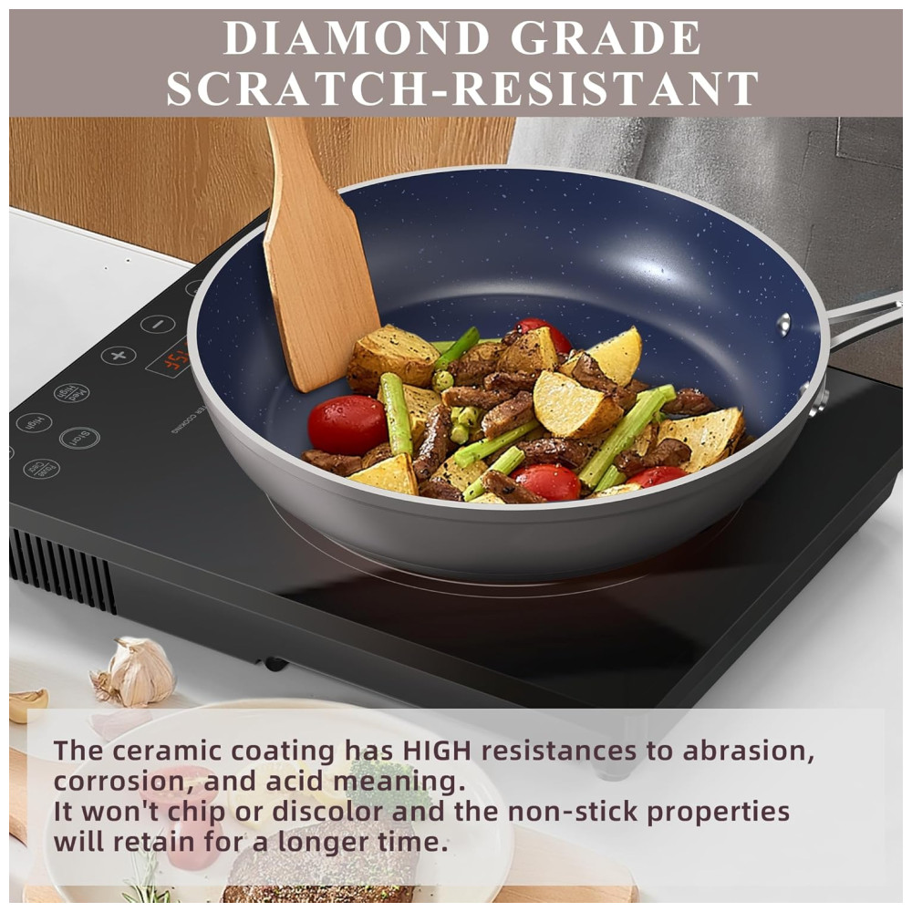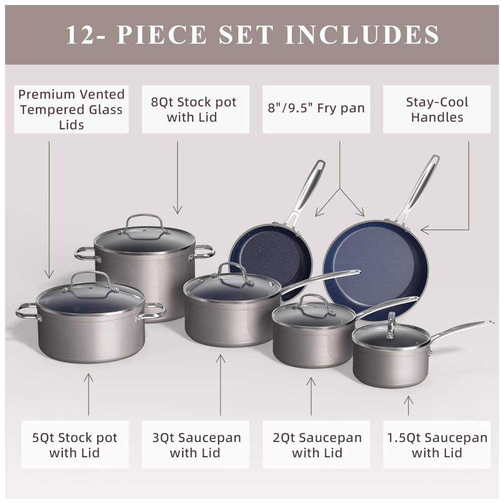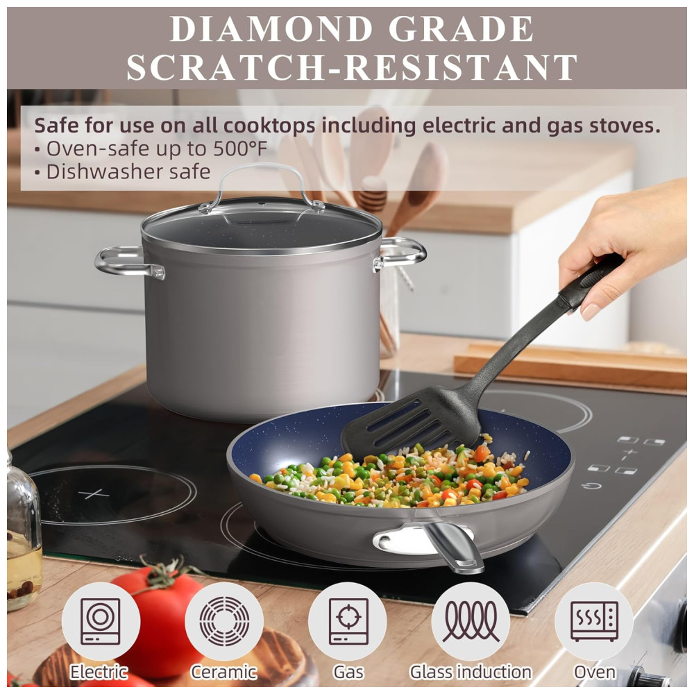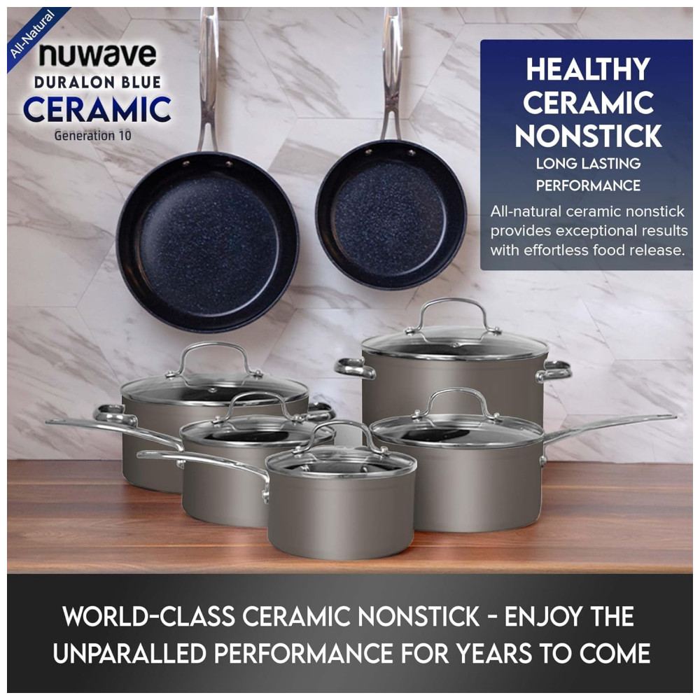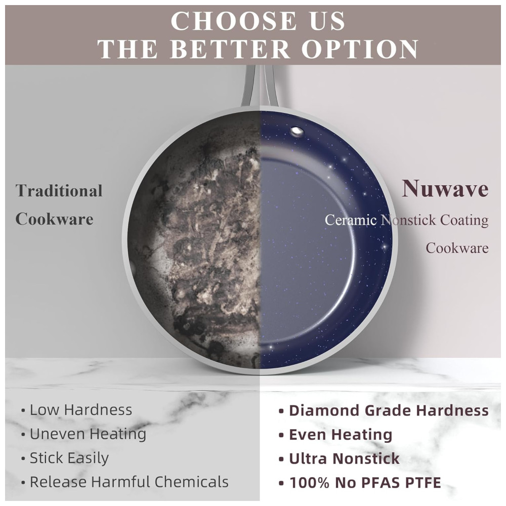 Conjunto de Panelas Antiaderente em Cerâmica 12 Peças com Infusão de Diamante sem PTFE e PFOA Seguro para Forno Tampas de Vidro Temperado e Alça que Permanece Fria NuWave Argila