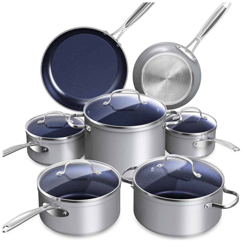 Cada panela é pronta para indução, proporcionando distribuição de calor rápida e uniforme e retenção superior de calor em qualquer temperatura. Além disso, cada peça do conjunto de panelas é segura para uso em todos os cooktops, incluindo fogões elétricos e a gás, e são seguras para forno até 260ºC.