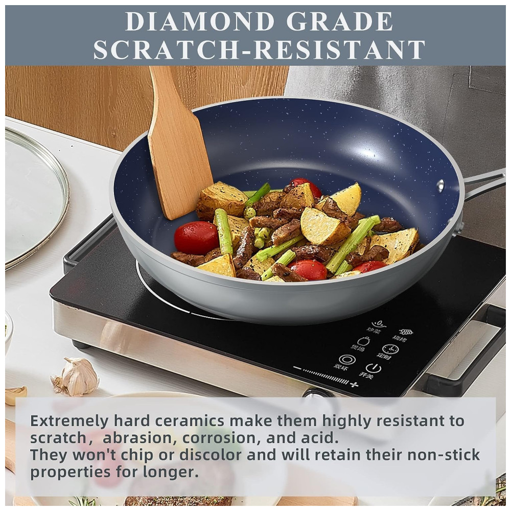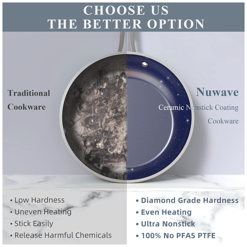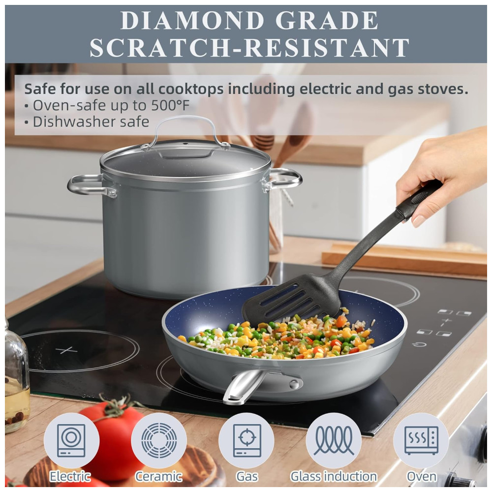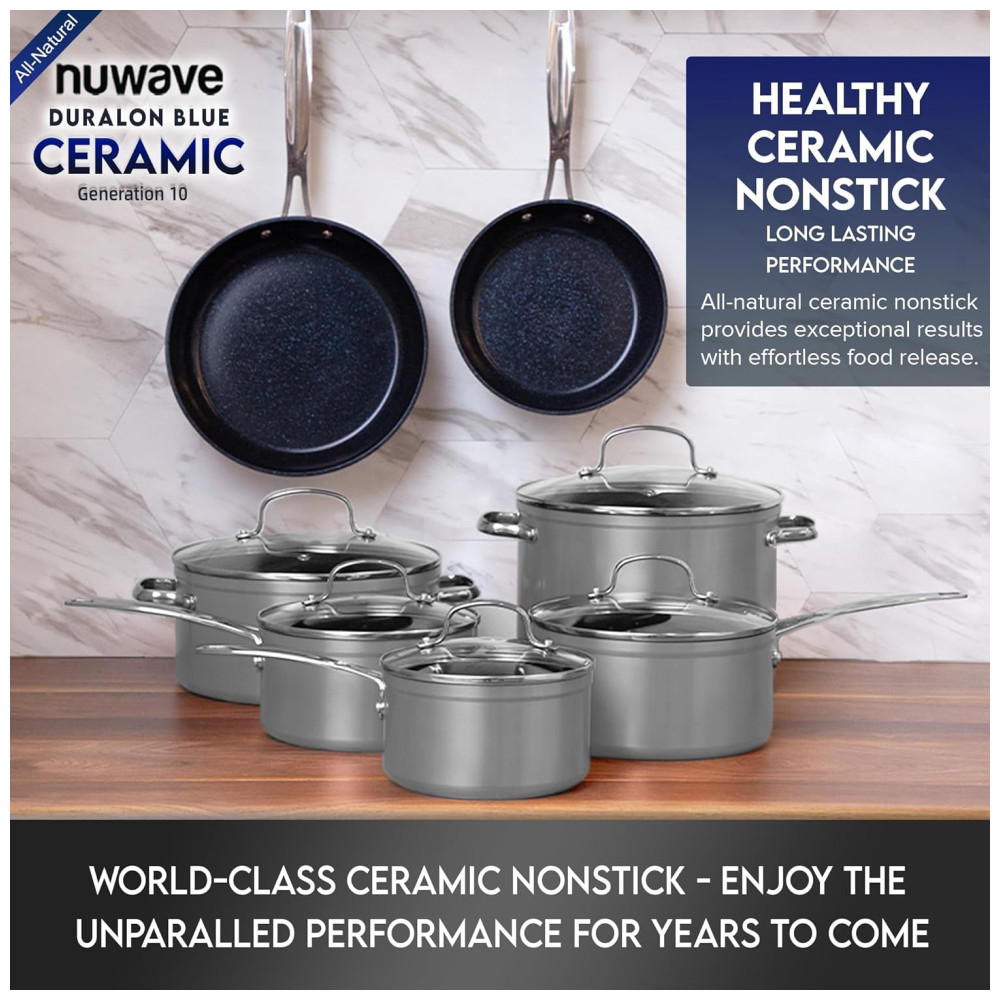 Conjunto de Panelas Antiaderente em Cerâmica 12 Peças com Infusão de Diamante sem PTFE e PFOA Seguro para Forno Tampas de Vidro Temperado e Alça que Permanece Fria NuWave Cinza e Azul