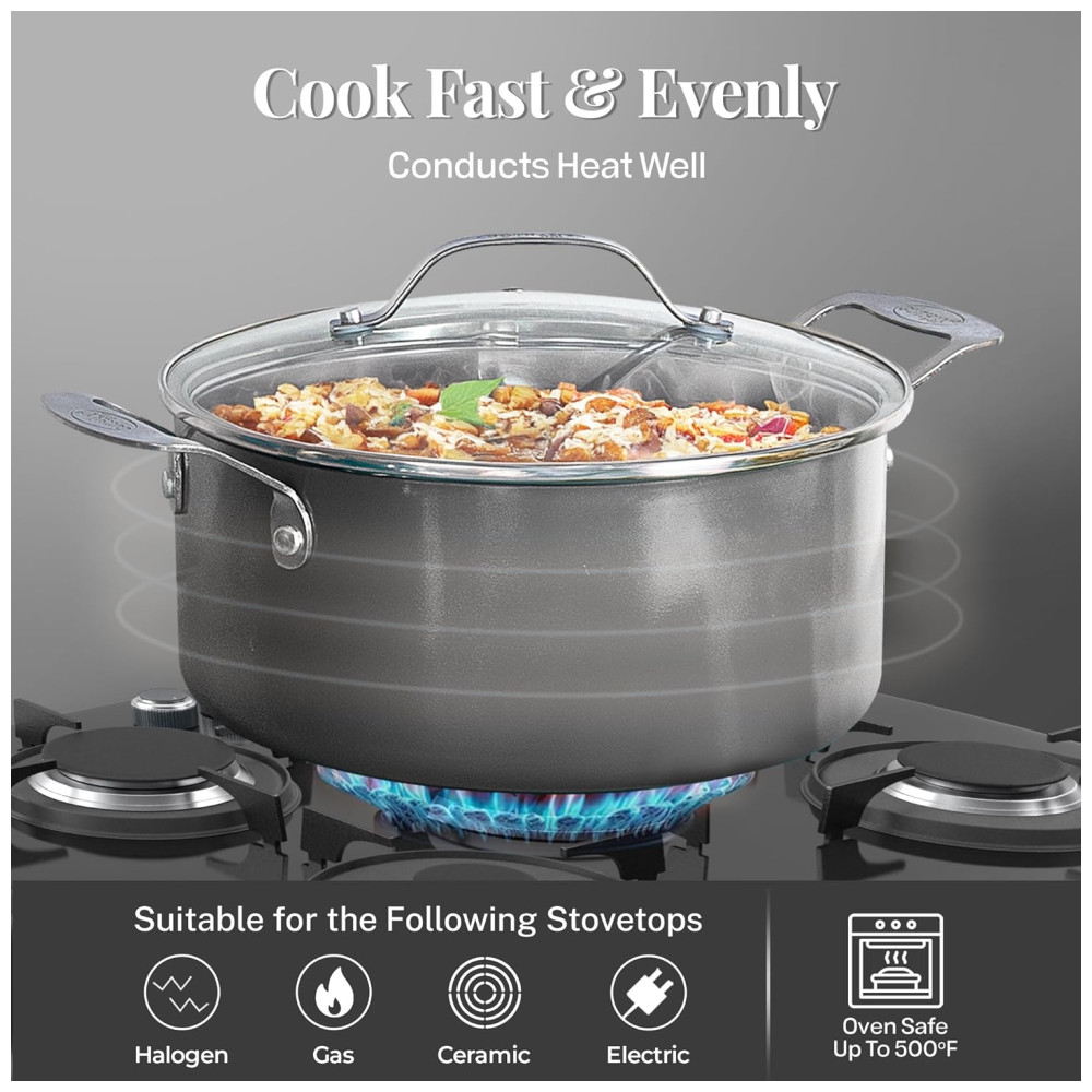 Forno até 260 C, as panelas e frigideiras são adequadas para todos os fogões de mesa, exceto indução