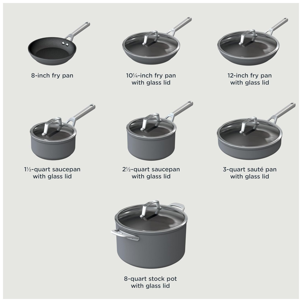 Componentes Incluídos: Frigideira Pequena de 20 cm, Panela de 7,5 litros com Tampa de Vidro, Frigideira Grande de 30 cm com Tampa de Vidro, Além da Panela de 7,5 litros, Frigideira de 26 cm e Panela de 3 litros compartilham uma tampa., Panela Média de 2,4 litros com Tampa de Vidro, Panela Pequena de 1,4 litros com Tampa de Vidro, Frigideira Média de 26 cm, Frigideira Grande de 26 cm com Tampa de Vidro