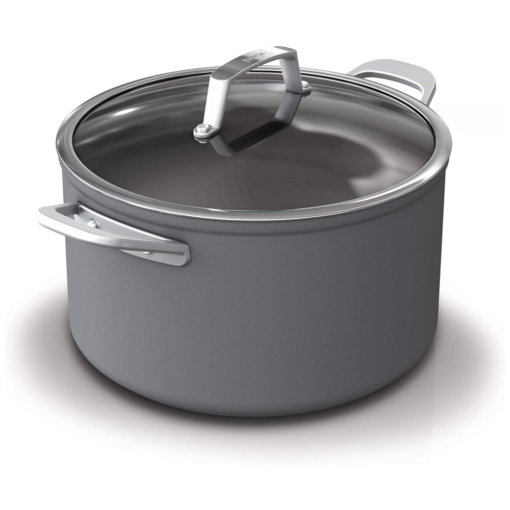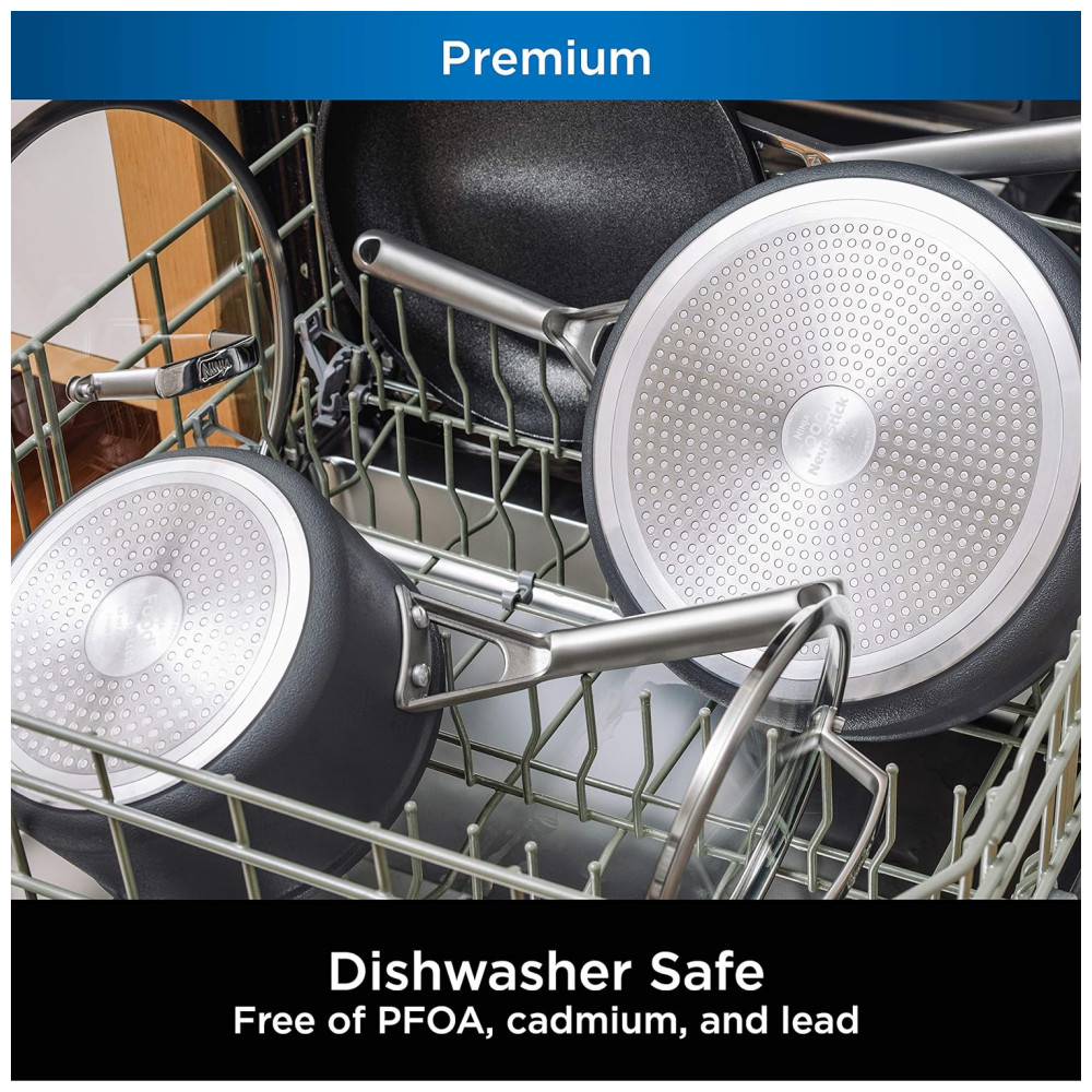 Exterior em Alumínio Anodizado Duro: Este conjunto de panelas premium possui um exterior extremamente durável, jateado e anodizado duro que resiste a arranhões como o aço inoxidável.