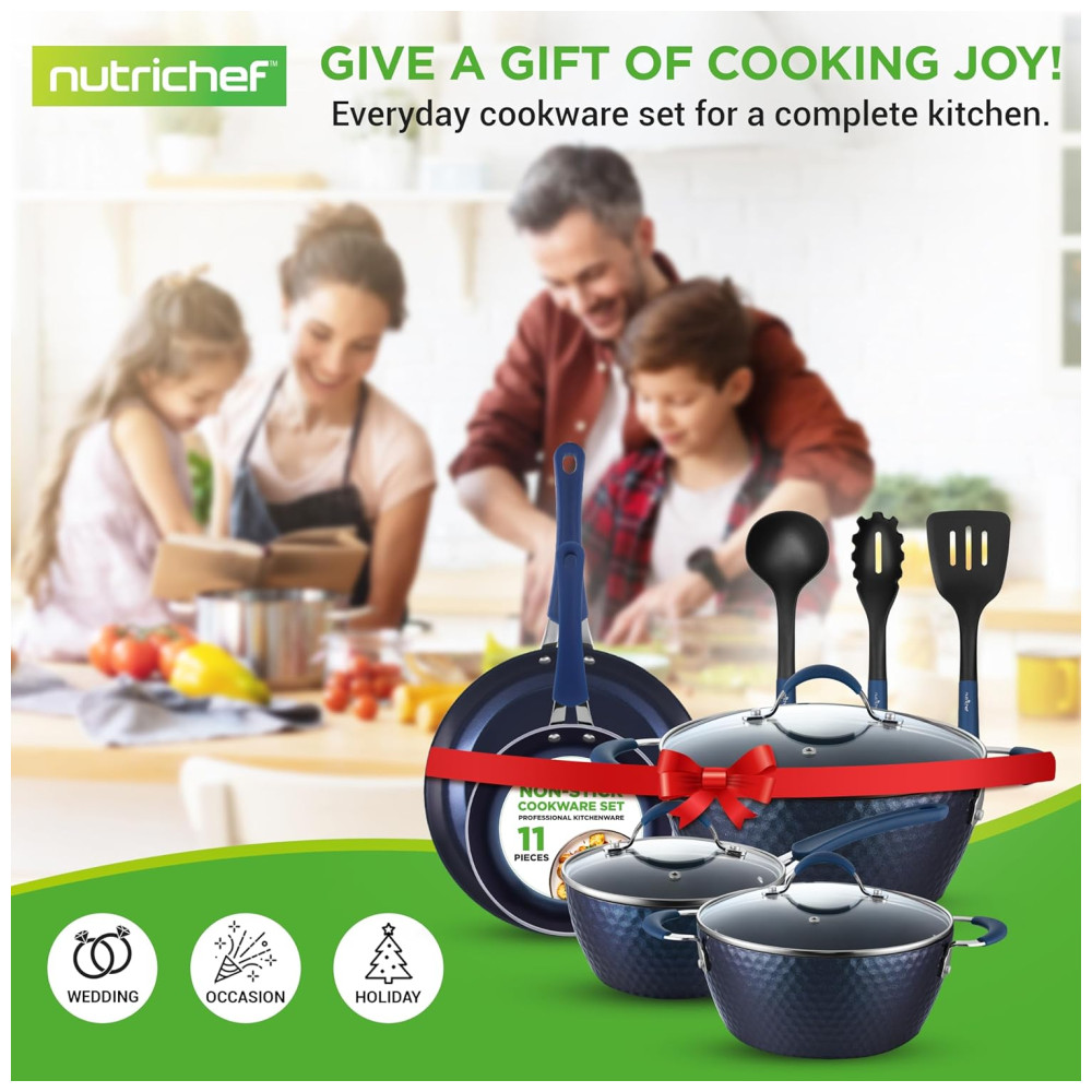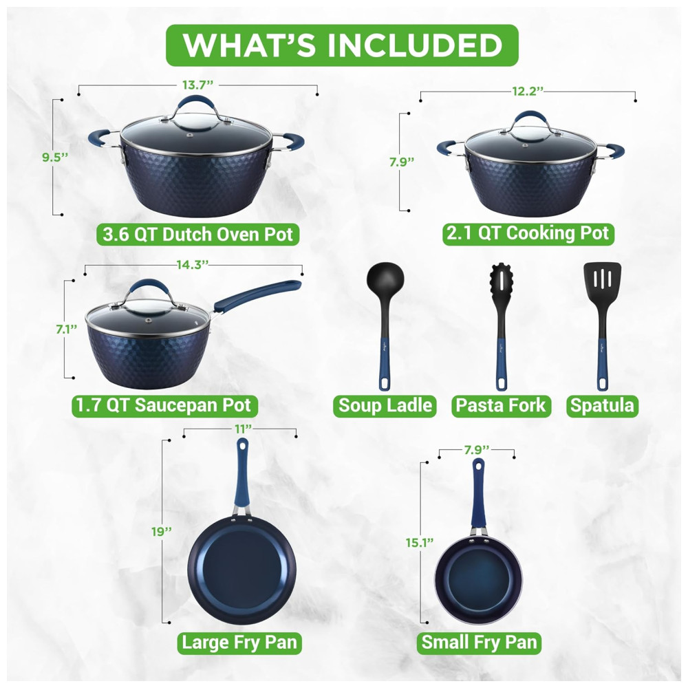 CONJUNTO DE 11 PEÇAS NutriChef oferece um conjunto de panelas antiaderente de 11 peças que inclui 1. panela de 6.6L com tampa, 3. panela holandesa de 5.6L com tampa, 2. panela de 1L com tampa, frigideira grande de , frigideira pequena, concha de sopa, garfo de macarrão e espátula