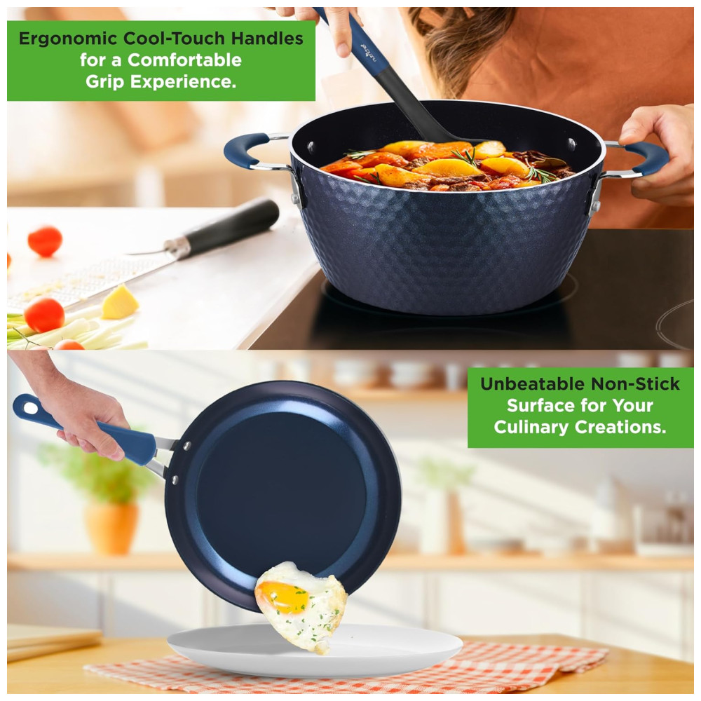 REVESTIMENTO ANTI COLANTE Os utensílios de cozinha do conjunto de panelas antiaderente apresentam um revestimento antiaderente durável e de longa duração para facilitar o lançamento, limpar e cozinhar de forma saudável. Possui exterior de cerâmica de diamante azul que torna o pote mais durável e com melhor transferência de calor