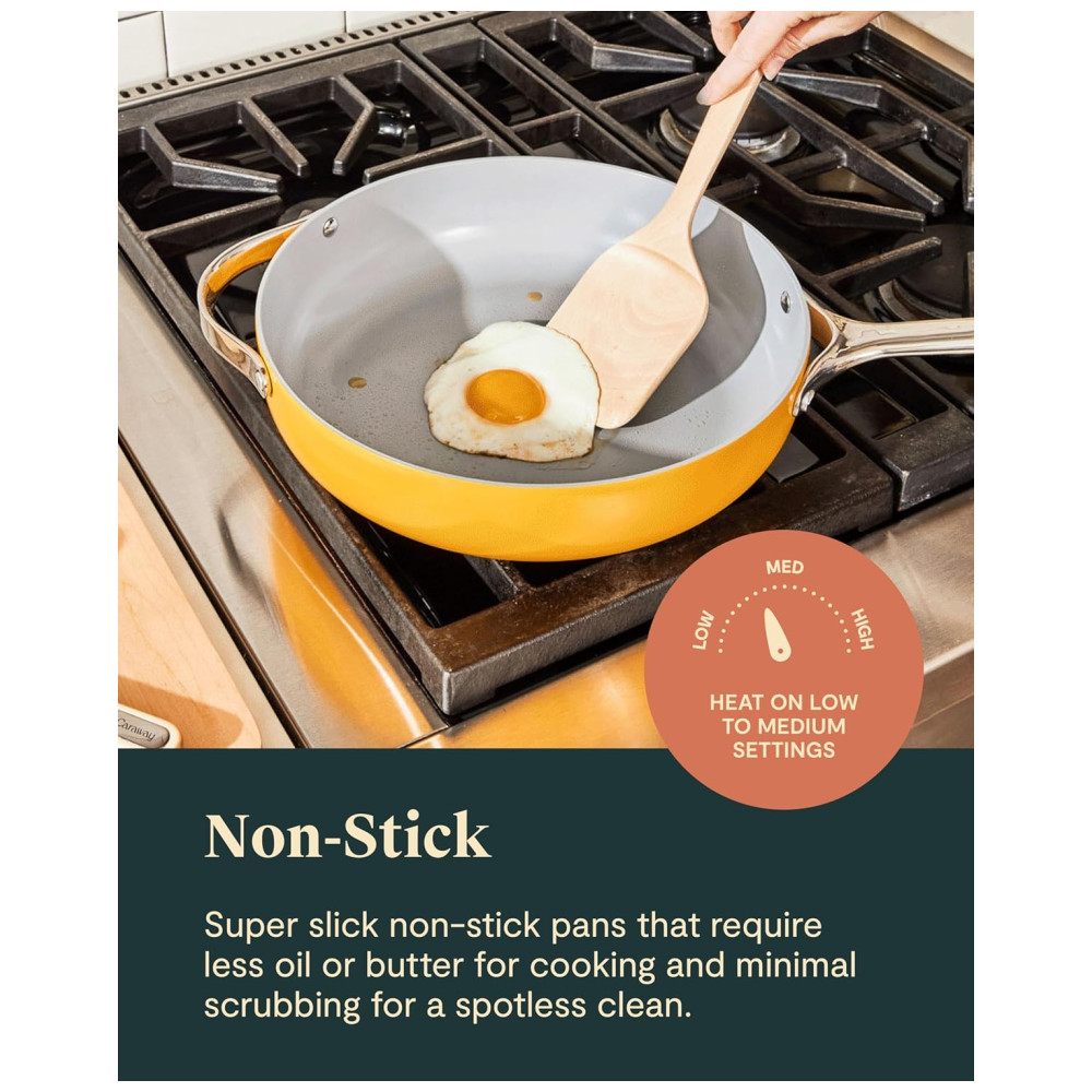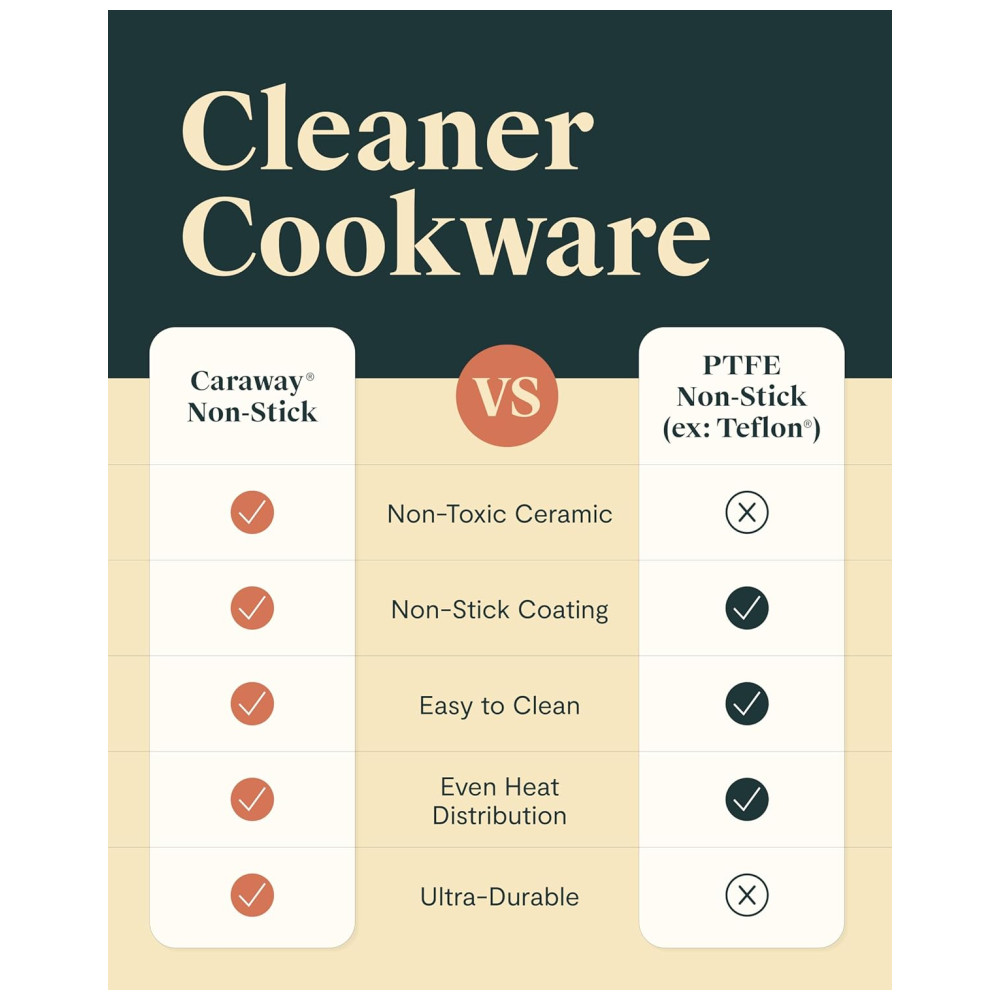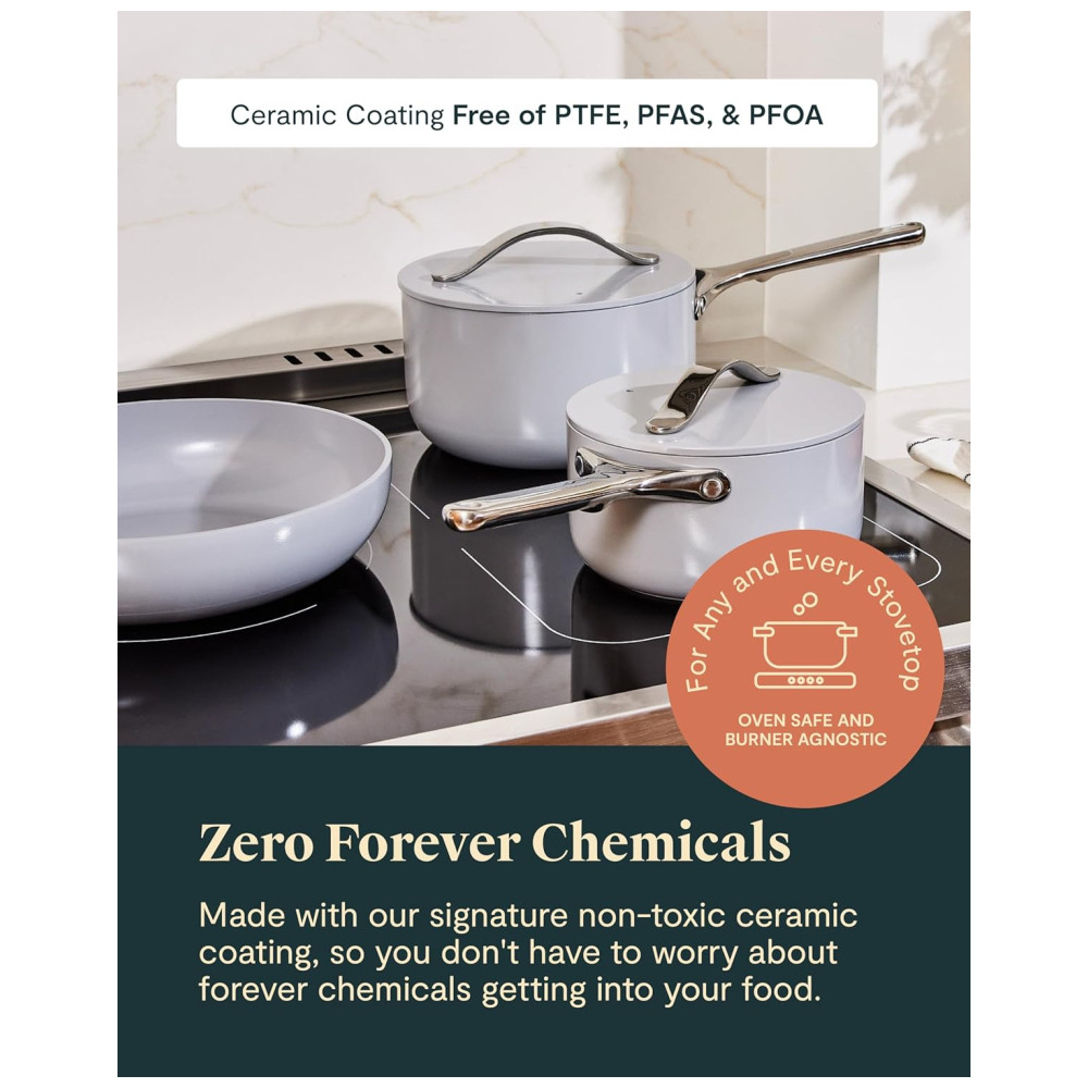 O conjunto de panelas cerâmicas Caraway conta com 12 peças essenciais, incluindo frigideira de 26,5 cm, panela com tampa de 2,8 L, frigideira wok com tampa de 4,2 L, panela tipo dutch oven de 6,2 L com tampa, quatro suportes magnéticos para panelas e um organizador de tampas em tela. Todas as peças possuem revestimento cerâmico antiaderente, livre de PTFE, PFOA e PFAS, eliminando o uso de químicos nocivos.
