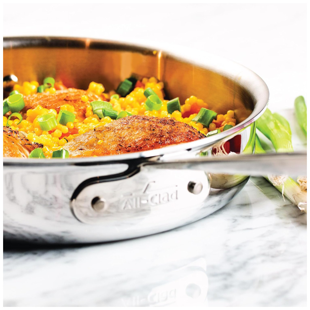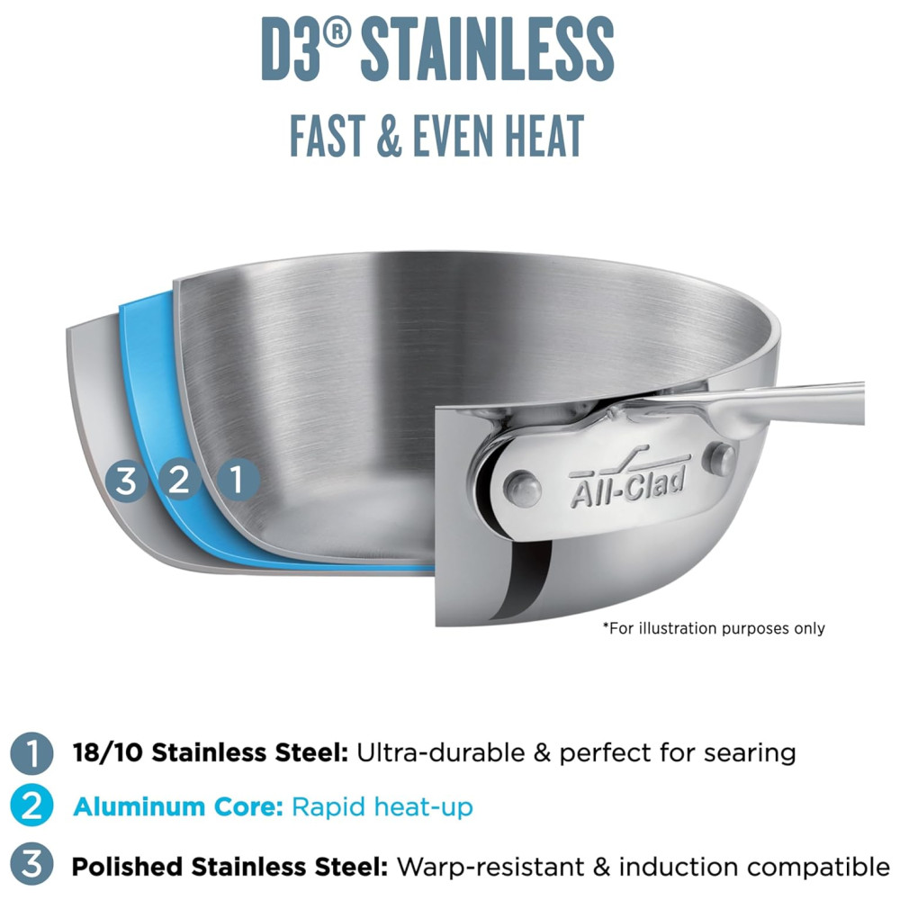 Este conjunto de panelas e frigideiras é feito com a excepcional construção tripla AllClad D3, que consiste em duas camadas de aço inoxidável durável pressionadas juntas com um núcleo de alumínio responsivo, garantindo distribuição uniforme de calor para cozinhar. O conjunto inclui uma frigideira, uma panela e uma panela com tampas correspondentes, além de uma frigideira adicional.
