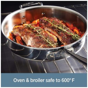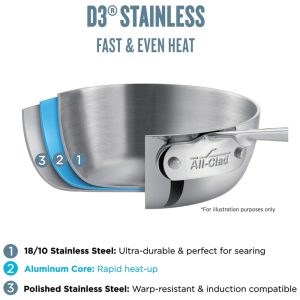 Este conjunto de panelas e frigideiras é feito com a excepcional construção tripla AllClad D3, que consiste em duas camadas de aço inoxidável durável pressionadas juntas com um núcleo de alumínio responsivo, garantindo distribuição uniforme de calor para cozinhar. O conjunto inclui uma frigideira, uma panela e uma panela com tampas correspondentes, além de uma frigideira adicional.
