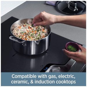 Cada peça é feita à mão nos EUA com aço inoxidável ultradurável que durará a vida toda e nunca sairá de moda. Além disso, essas panelas são versáteis e podem ser usadas em fogões a gás, elétricos ou de indução, forno ou grelha. As alças clássicas de aço inoxidável com rebites duplos garantem uma aderência segura.