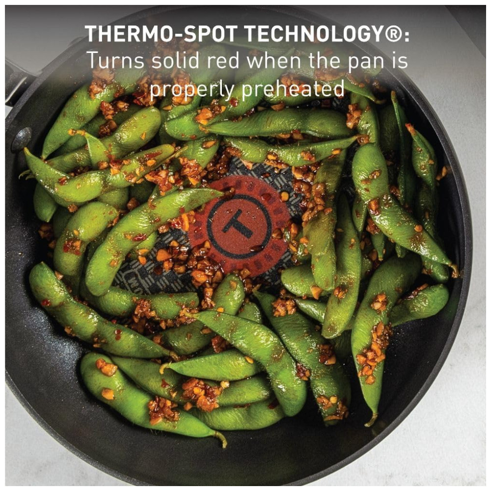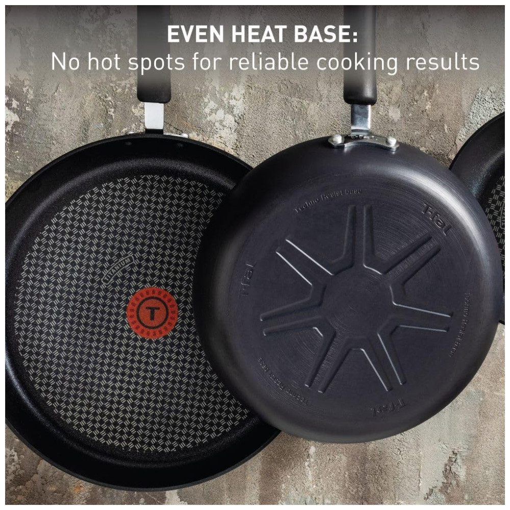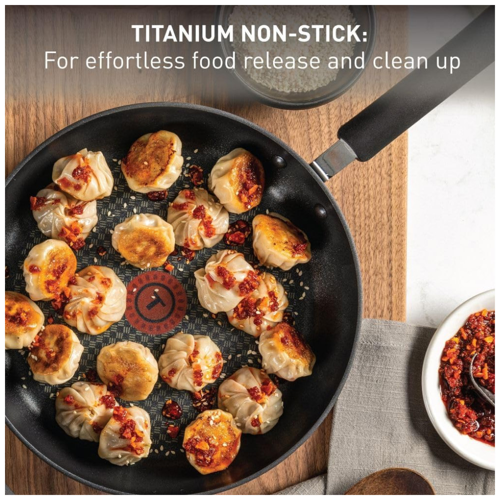ANTIADERENTE DURÁVEL Reforçado com titânio duro, resistente a arranhões e antiaderente livre de toxinas, resiste ao uso diário e mantém os alimentos deslizando suavemente ao longo da superfície, facilitando o cozimento e a limpeza.