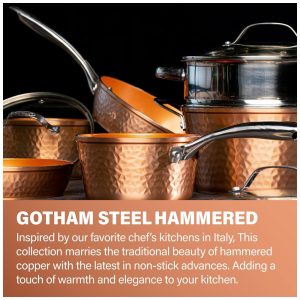Conjunto de panelas e frigideiras marteladas de aço Gotham antiaderente, conjunto elegante de utensílios de cozinha com 15 peças e conjunto de assadeiras, panelas e frigideiras ultra duráveis para cozinhar com revestimento de cerâmica antiaderente, lavável na lava louças, livre de toxinas.
