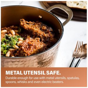 Ultradurável com os clientes em mente, as panelas Gotham Steel são projetadas para durar anos a fio sem desgaste. Cada peça de panela é durável o suficiente para suportar qualquer utensílio de metal, espátulas, colheres, batedores e até mesmo batedores elétricos.
