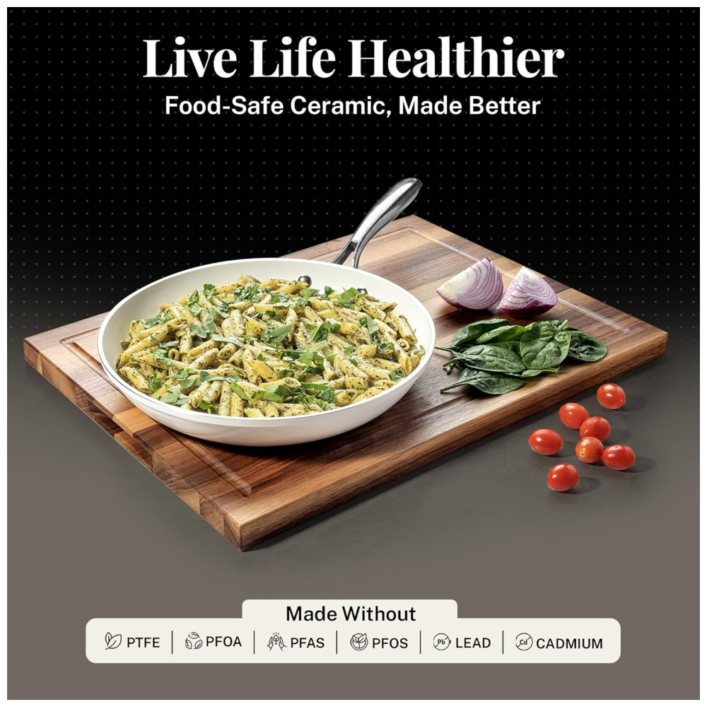 O conjunto completo inclui uma frigideira de 20 cm uma frigideira de 26 cm com tampa de vidro, uma panela de 1,40 litros, uma panela de 2,33 litros com tampa, uma panela de 4,66 litros com tampa, um conjunto completo de assadeiras de 5 peças e um conjunto de facas Nutriblade de 6 peças. A cor creme moderna do conjunto acrescenta uma estética elevada à sua cozinha.