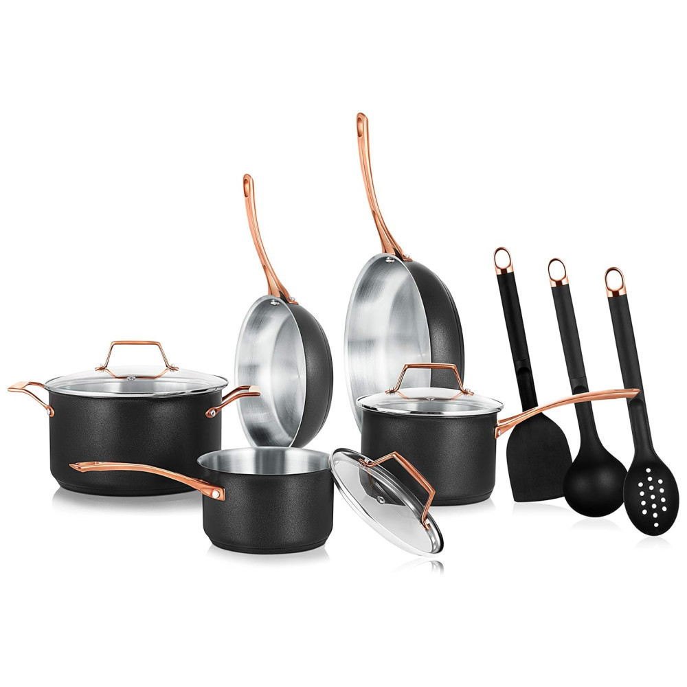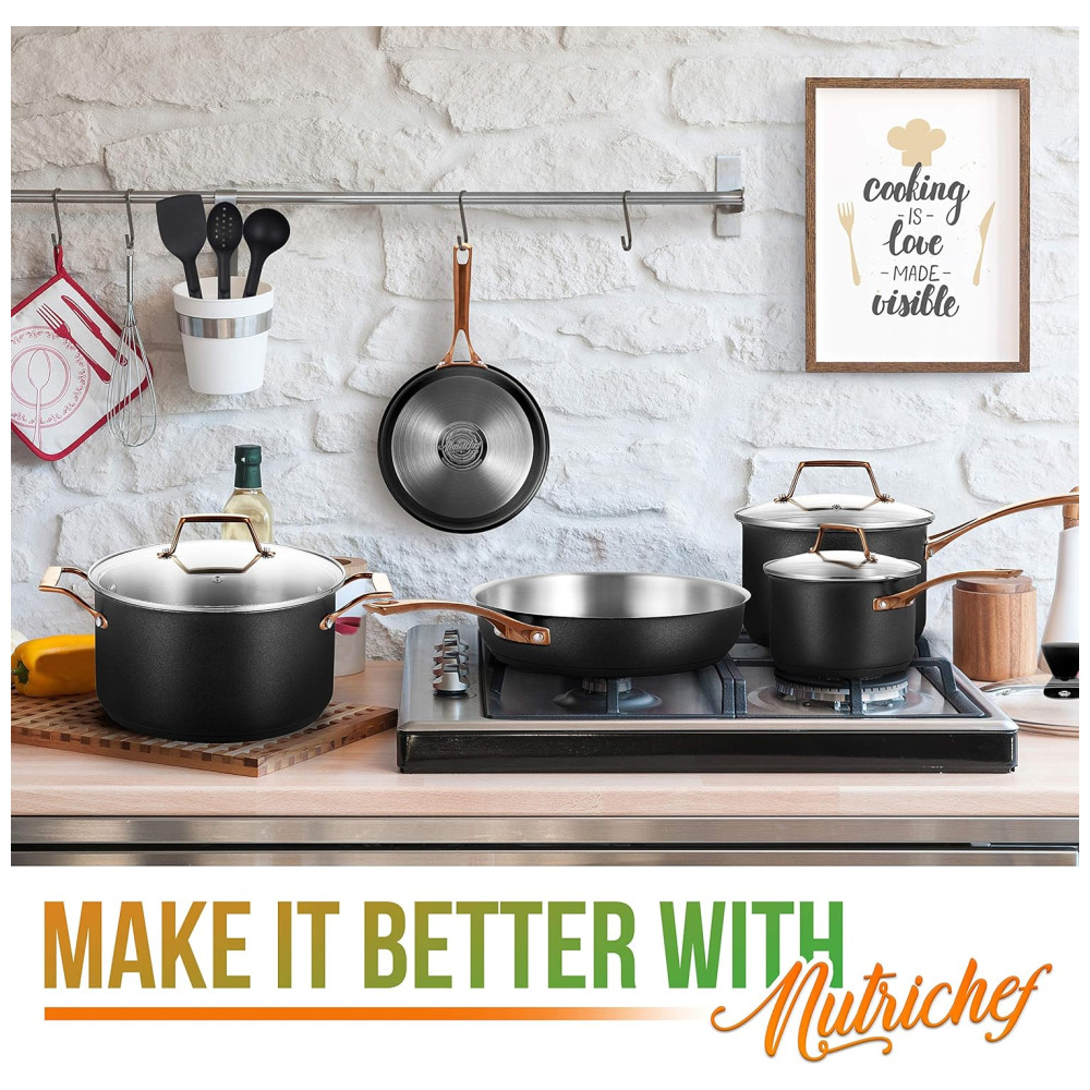 CONJUNTO DE 11 PEÇAS NutriChef oferece um conjunto de panelas antiaderente de 11 peças que inclui panela de 1.8L com tampa, panela de 2.3L com tampa, caçarola de 5.6L com tampa, frigideira aberta de , frigideira aberta de , concha de sopa, escumadeira e espátula