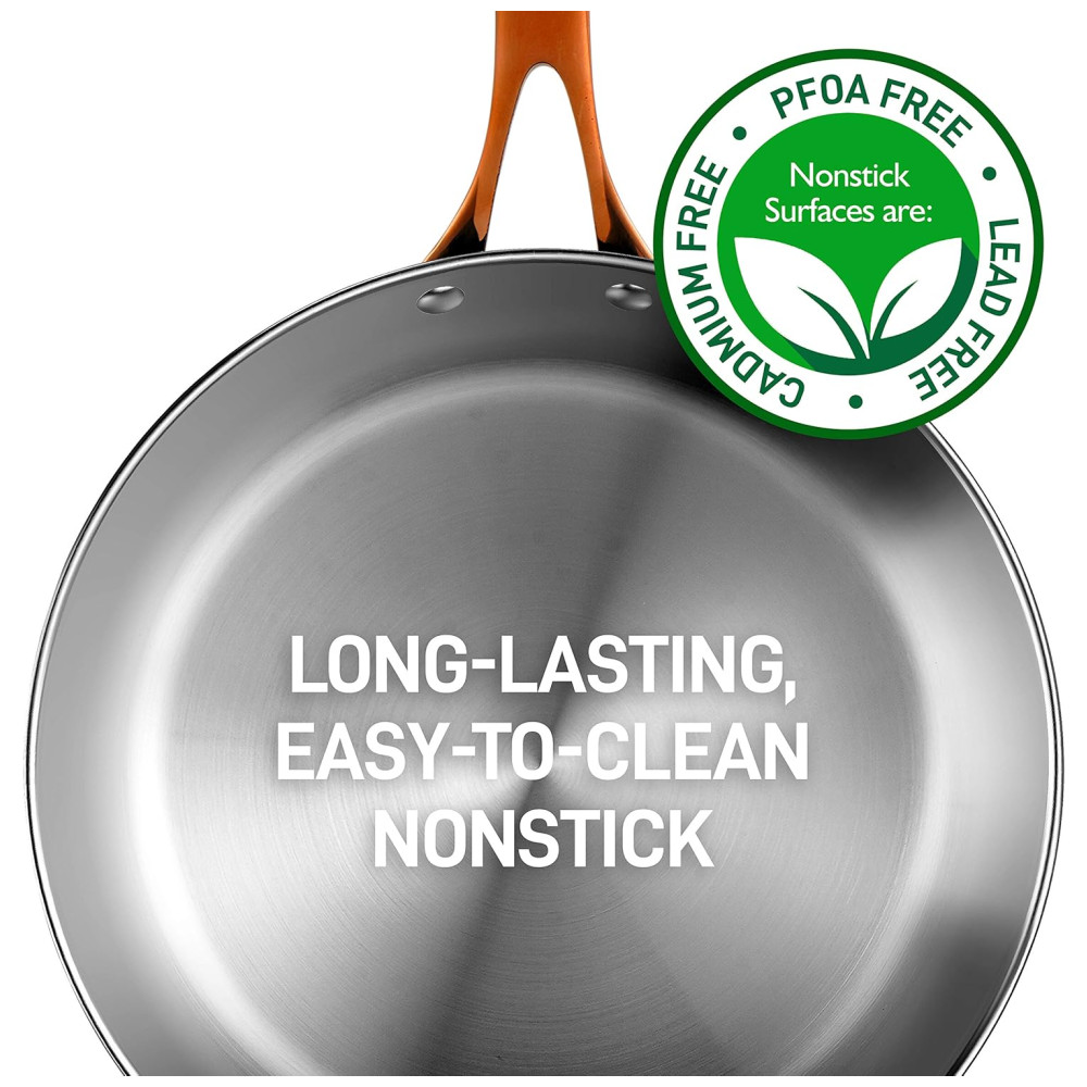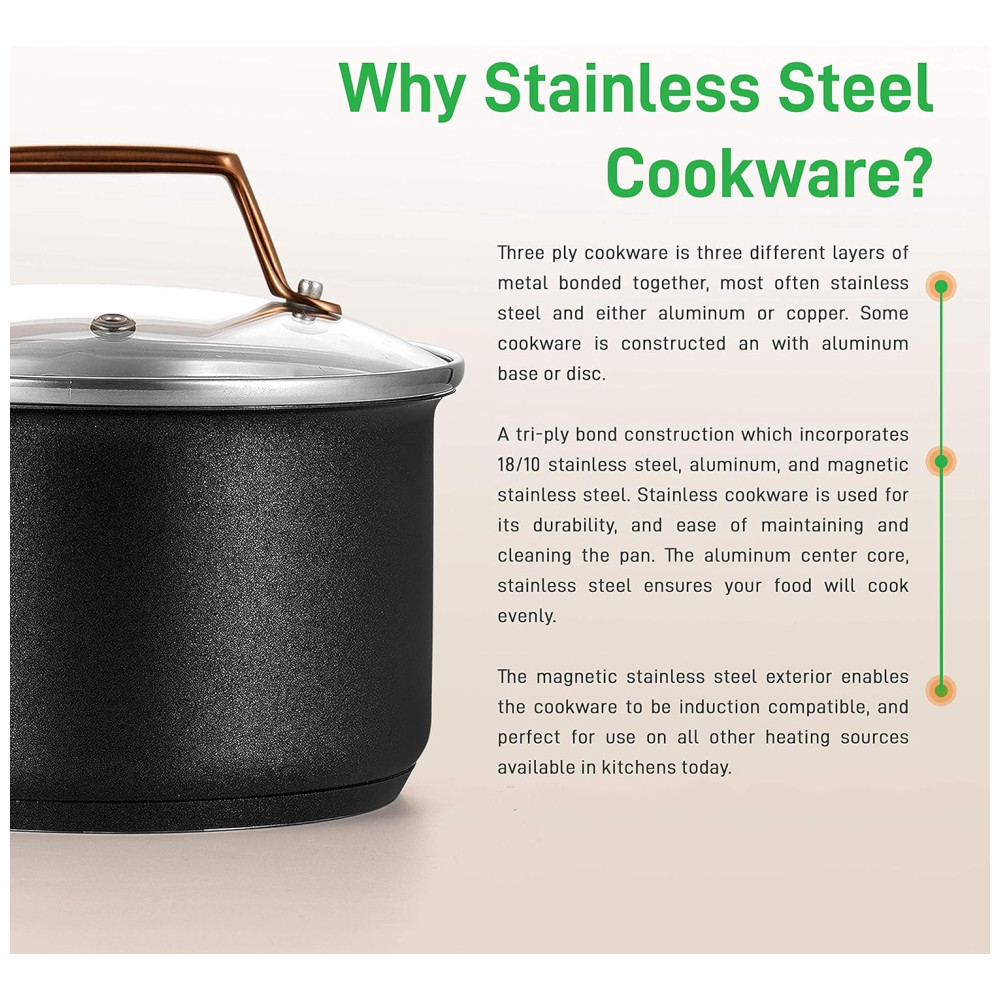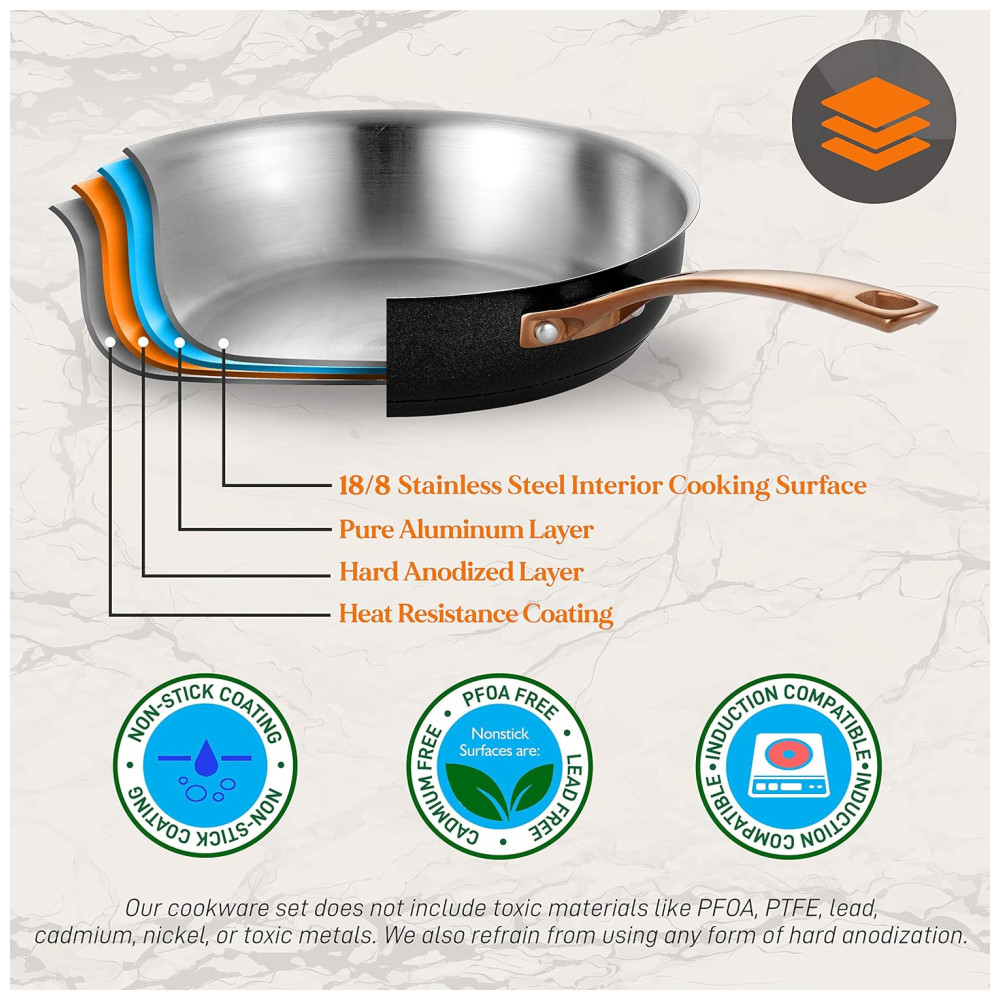 REVESTIMENTO ANTI COLA Os utensílios de cozinha do conjunto de panelas antiaderente apresentam um revestimento antiaderente durável e de longa duração para facilitar o lançamento, limpeza e cozimento saudável. Os utensílios de cozinha de três camadas são três camadas diferentes de metal coladas