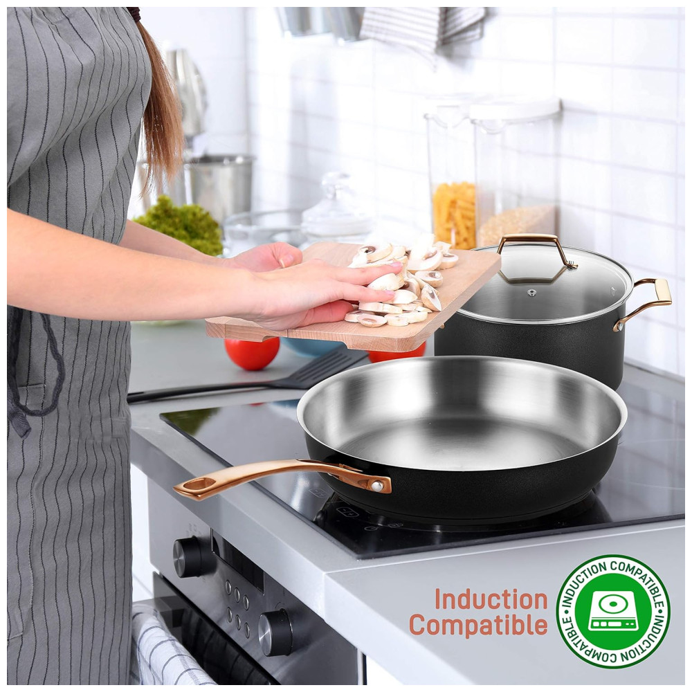 INDUÇÃO PRONTA Essas frigideiras e frigideiras são seguras para uso em contadores a gás, elétricos, de cerâmica e de indução. Feito de aço inoxidável e nylon projetado com espessura de revestimento de 25 35um, 3, em várias camadas. Inclui utensílios de cozinha resistentes ao calor